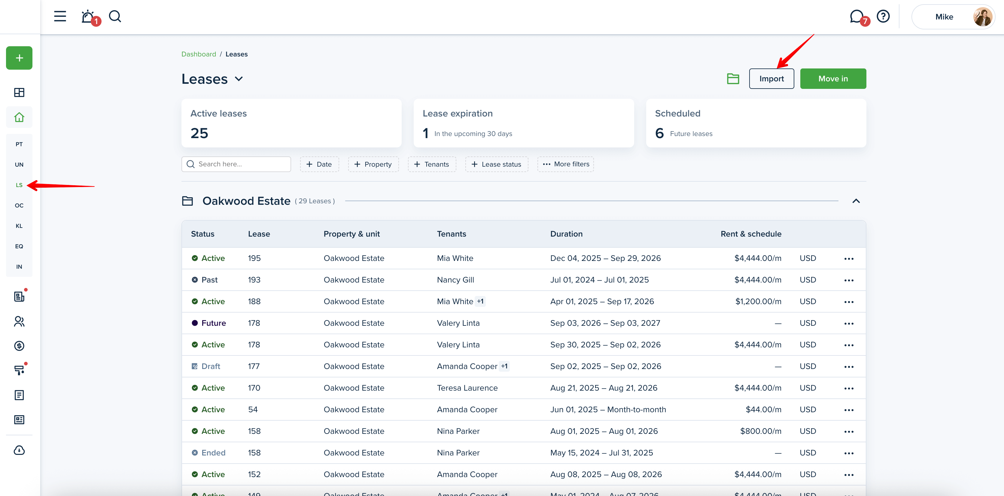 To start, go to the Portfolio page and click on the Leases/ Occupancy Board sub-page. Next, click on the “Import” button in the upper right corner to start the import process: