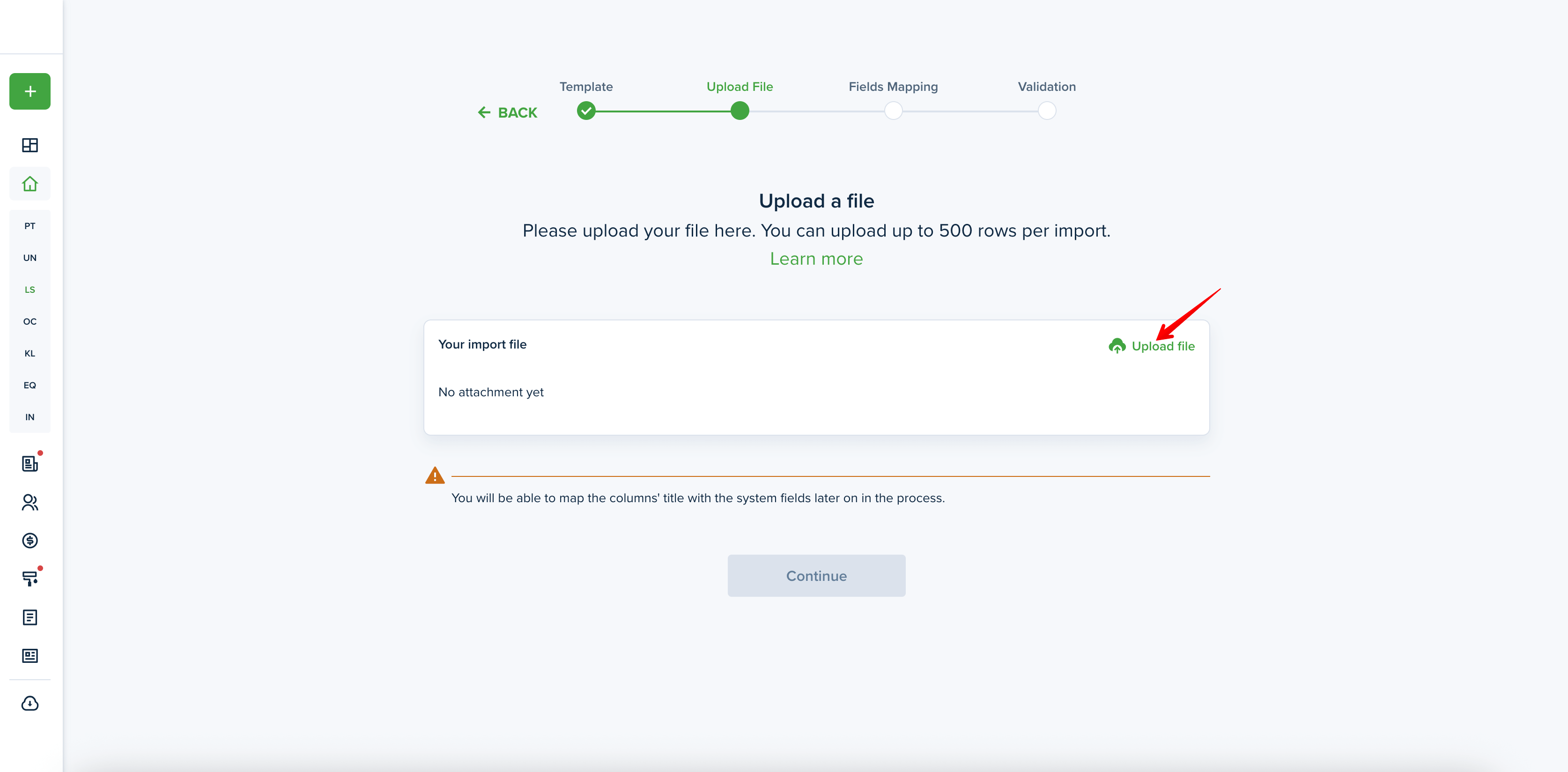 When you’ve filled out the necessary information, save your changes and return to the import page. You can then click the “I'm ready to import“ button. Click on “Upload file” to import the edited file sample. Once the template is loaded, click “Continue” to move to the next step: