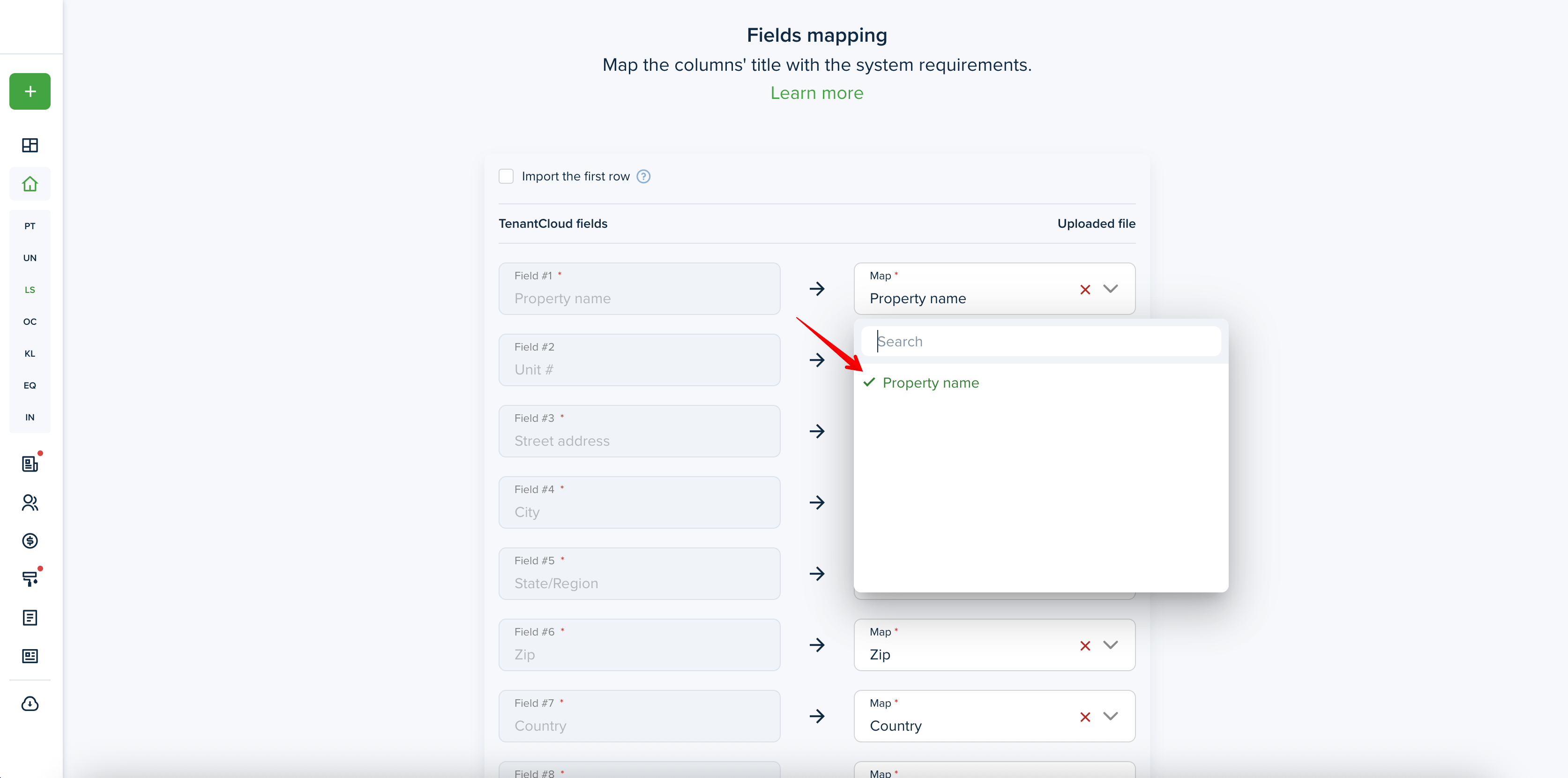 If you used your own template, you’ll need to ensure the fields match in this step. For “Fields mapping,” you will want to match the system fields with the columns from the uploaded file so that the information is imported correctly. Please make sure to match all of the required fields, including property name, street address, city, state, ZIP, country, unit type, unit number, tenant(s) full name, tenant portal share, and lease start date.