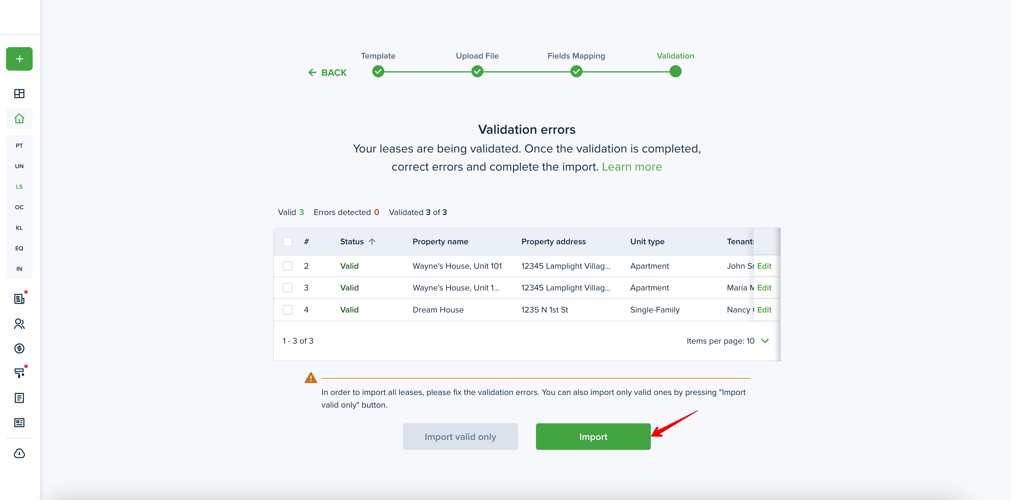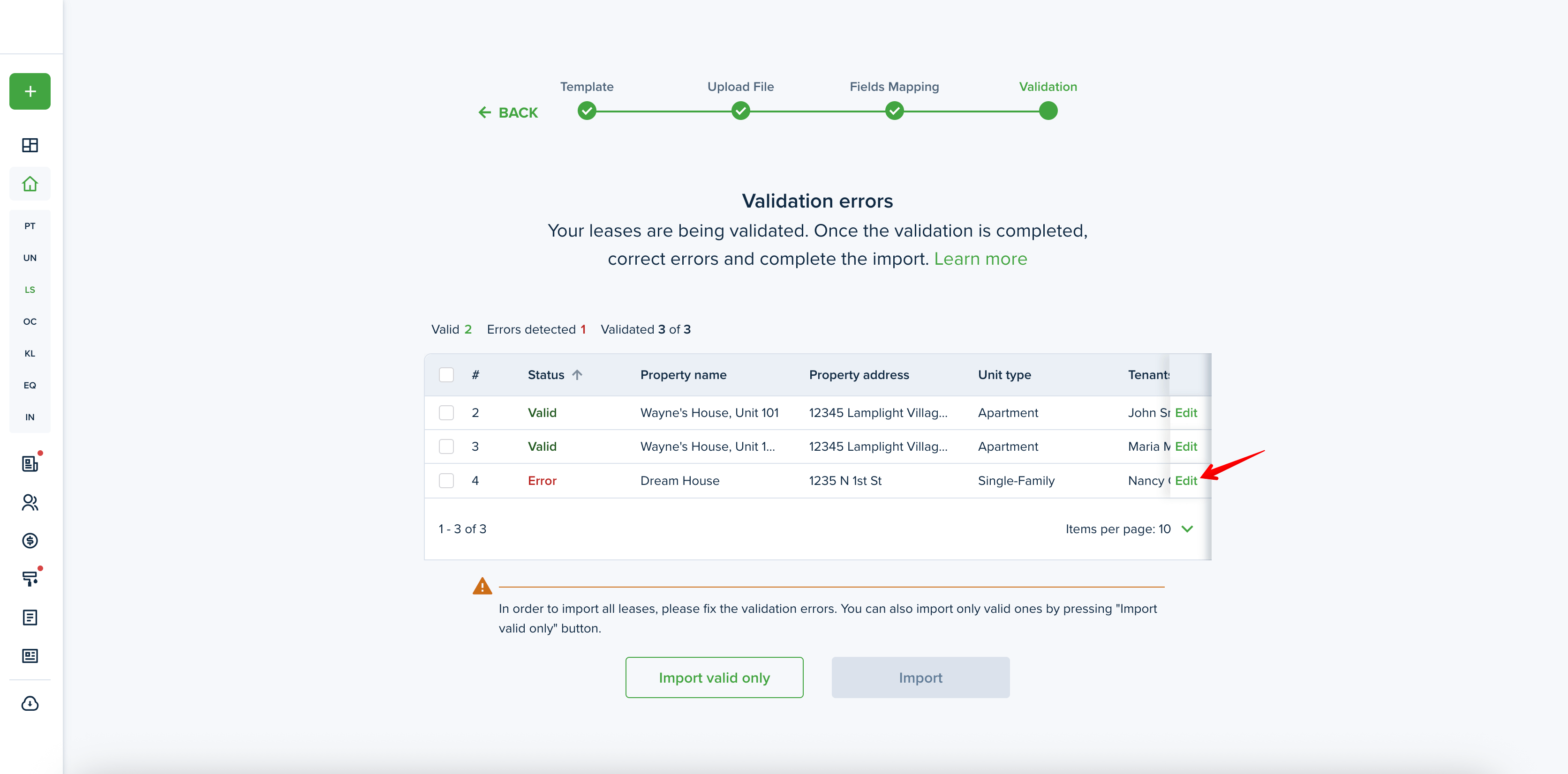 After importing, check for any issues with property, tenant, and lease validation, and see how many leases were successfully validated on the final “Validation” step. If there are any errors, you can edit the data here: