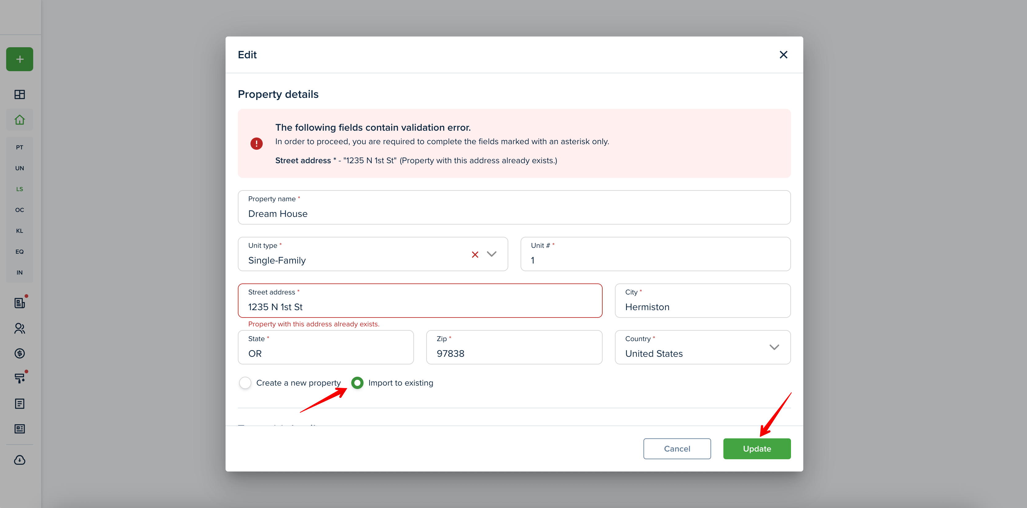 If the property or tenant details you enter already exist in the system, you’ll have the option to either create a new record or import to the existing one: