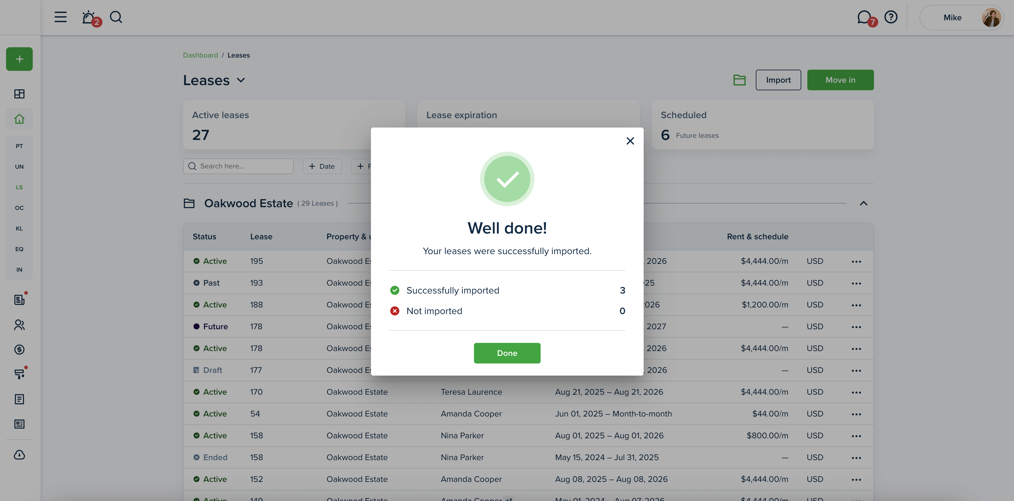 The “Well done!” page shows the number of leases that were imported successfully. You can find your imported list of leases on the Leases and Occupancy Board pages.