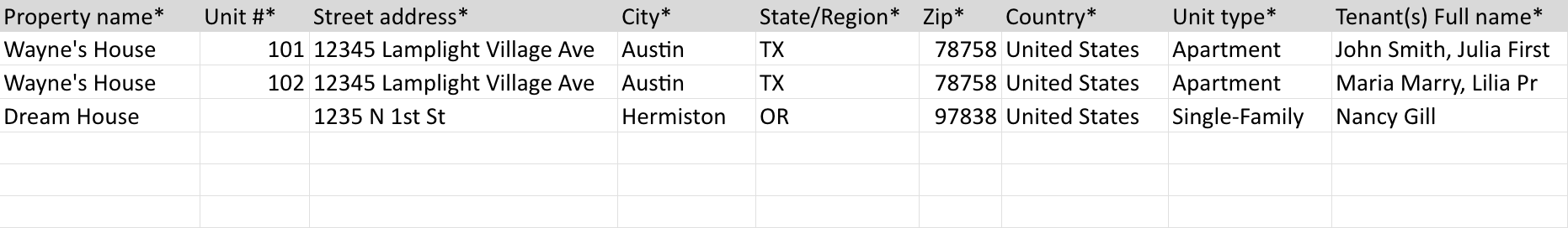 - You can import single-family and multi-family properties. For single-family properties, leave the "Unit number" field empty. For multi-family properties, please include the "Unit number.”