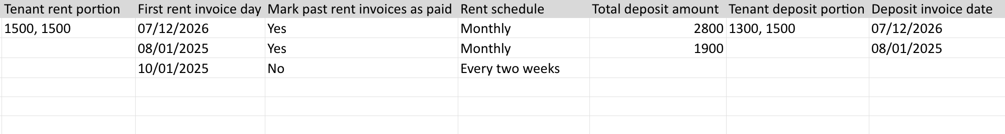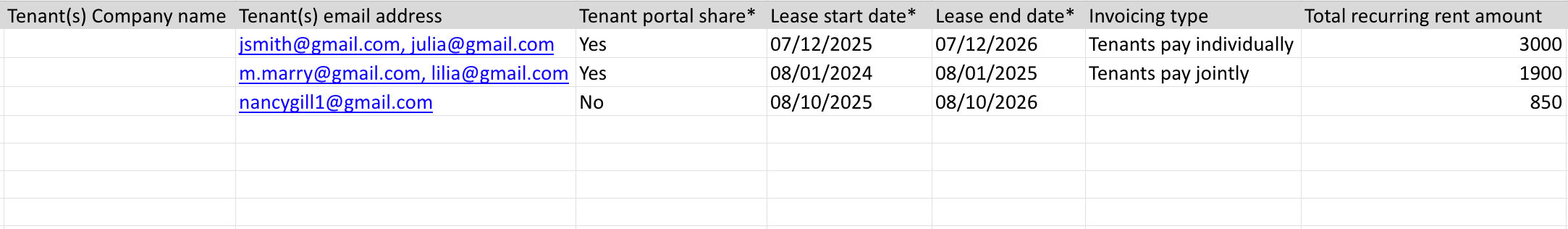 - For multiple tenants on a lease, enter their names in the “Tenant(s) Full name” column, separated by commas.