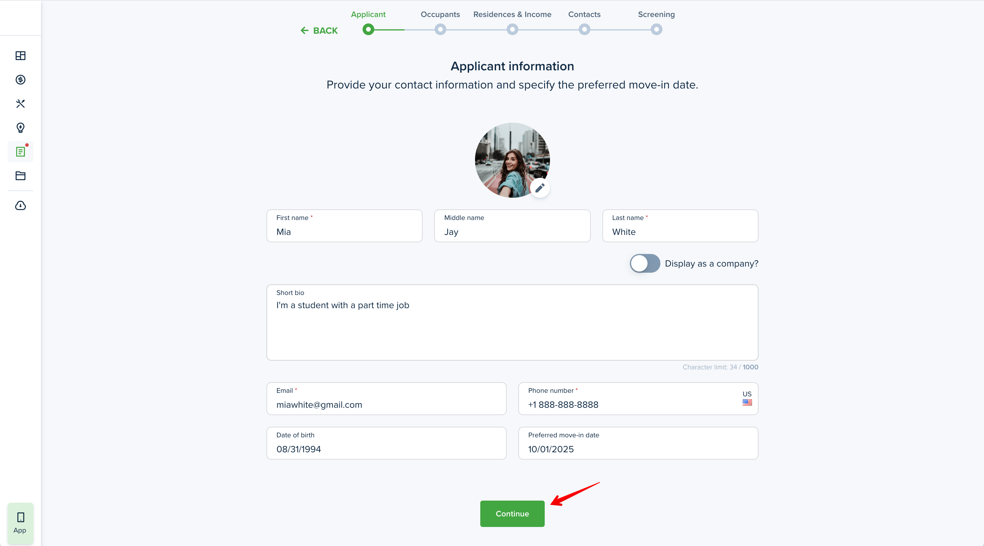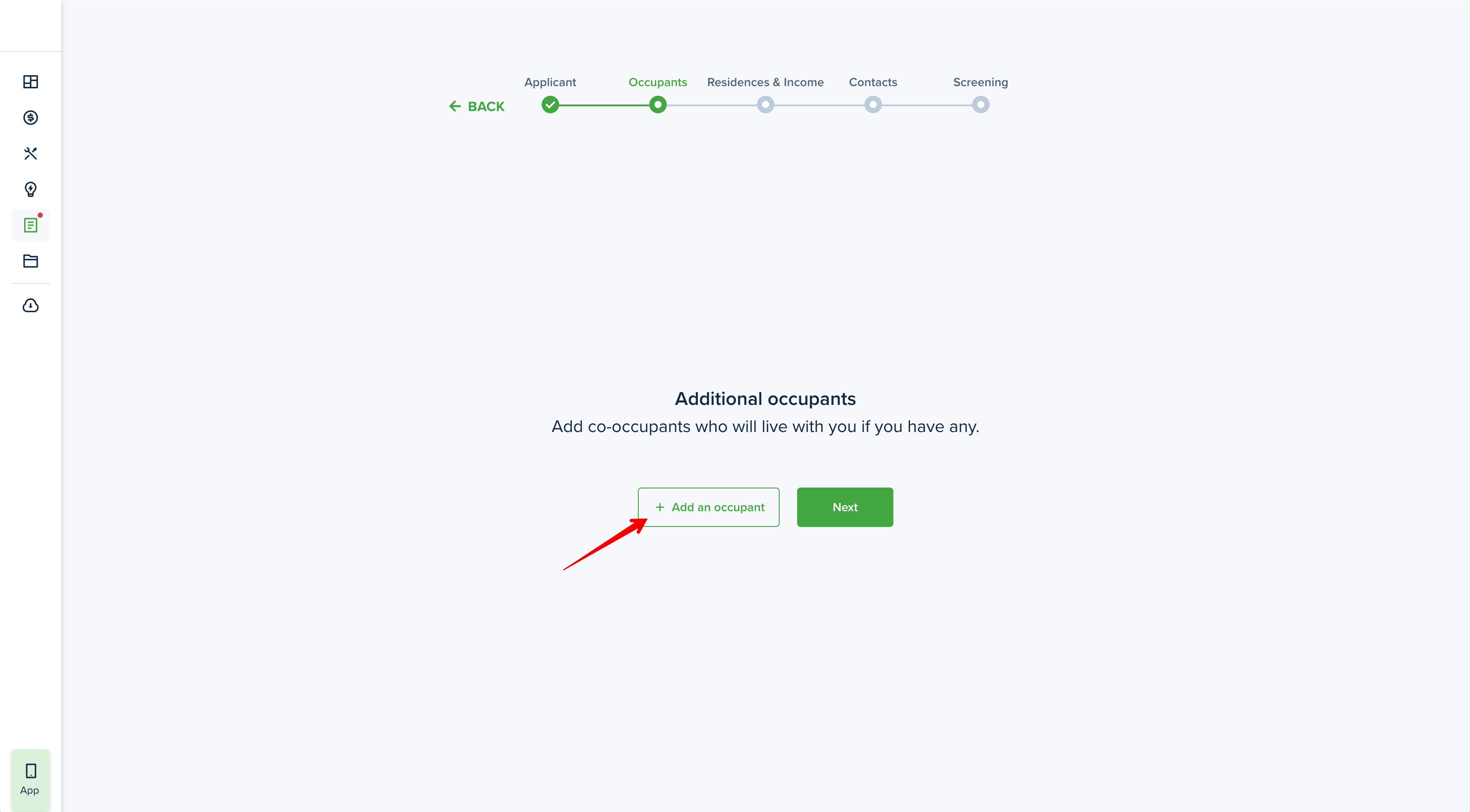 If you are applying with another co-applicant, press "+ Add an occupant" and provide the required information. Your co-applicants will receive a link to submit a rental application.