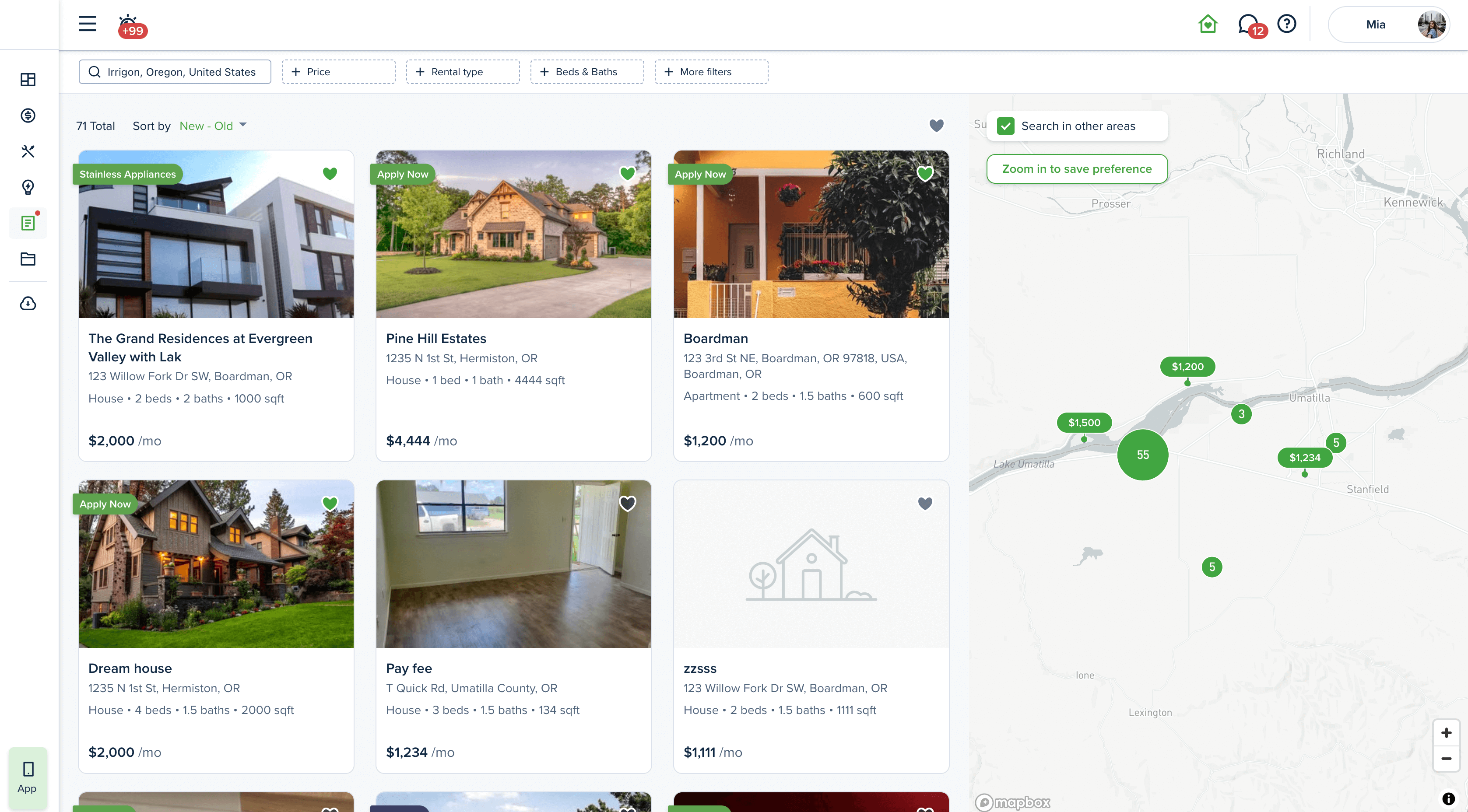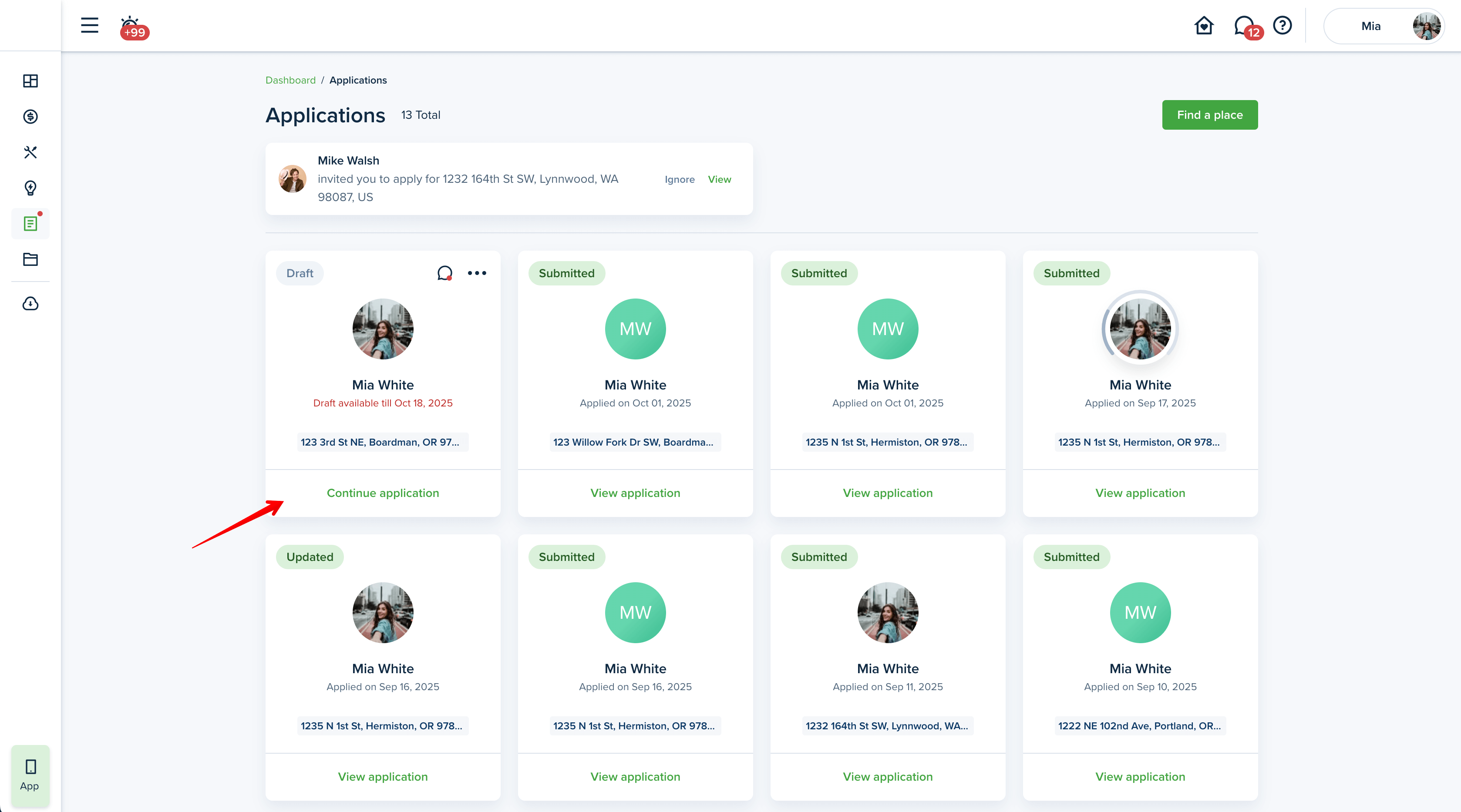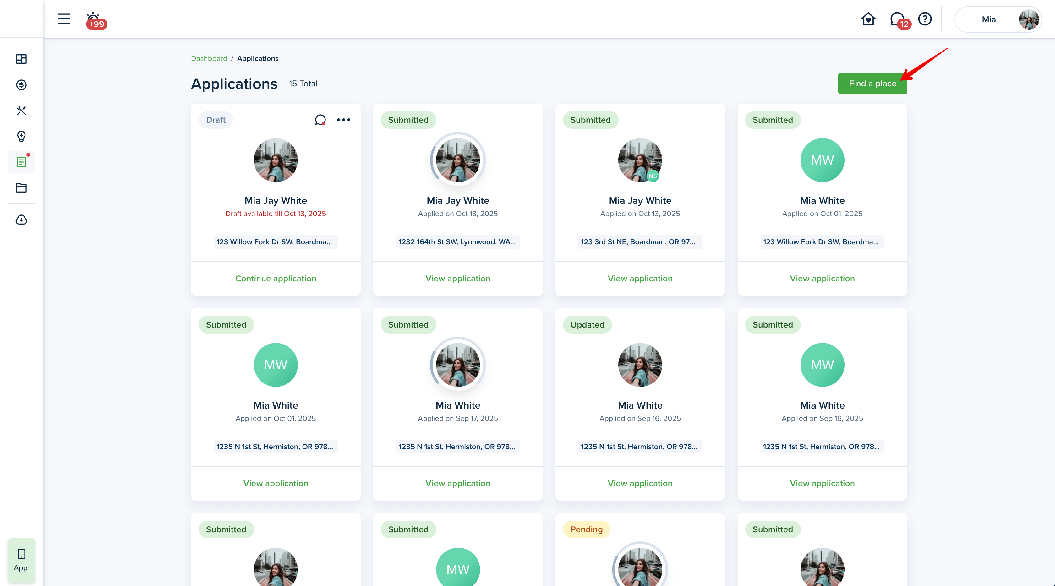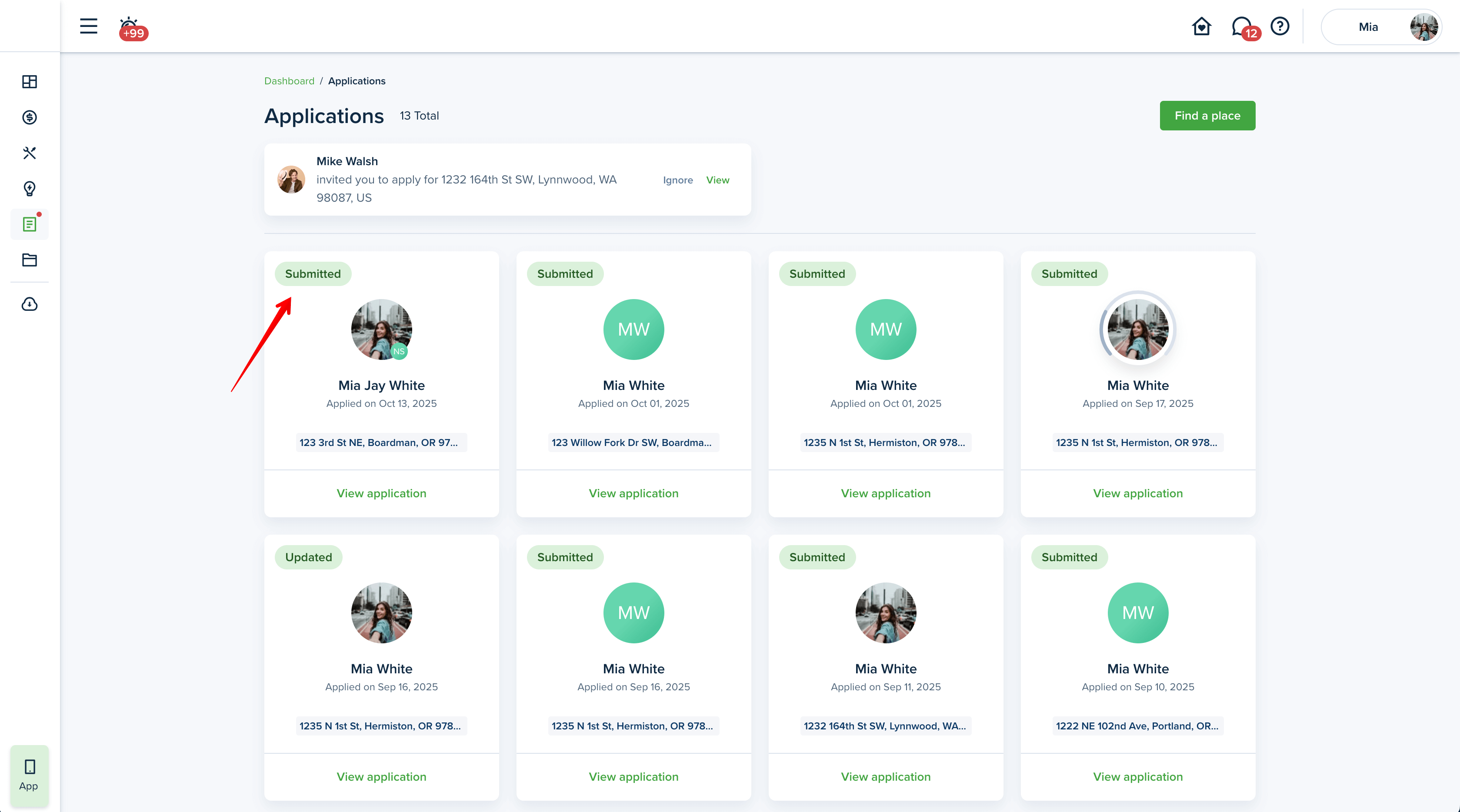 On the Applications page, you can find a prospective rental and submit your rental application, click the "Find a place" button in the upper right-hand corner, enter the city, state, or zip code of the location you are interested in. Click on a listing and you'll be able to apply online or contact the landlord/property manager: