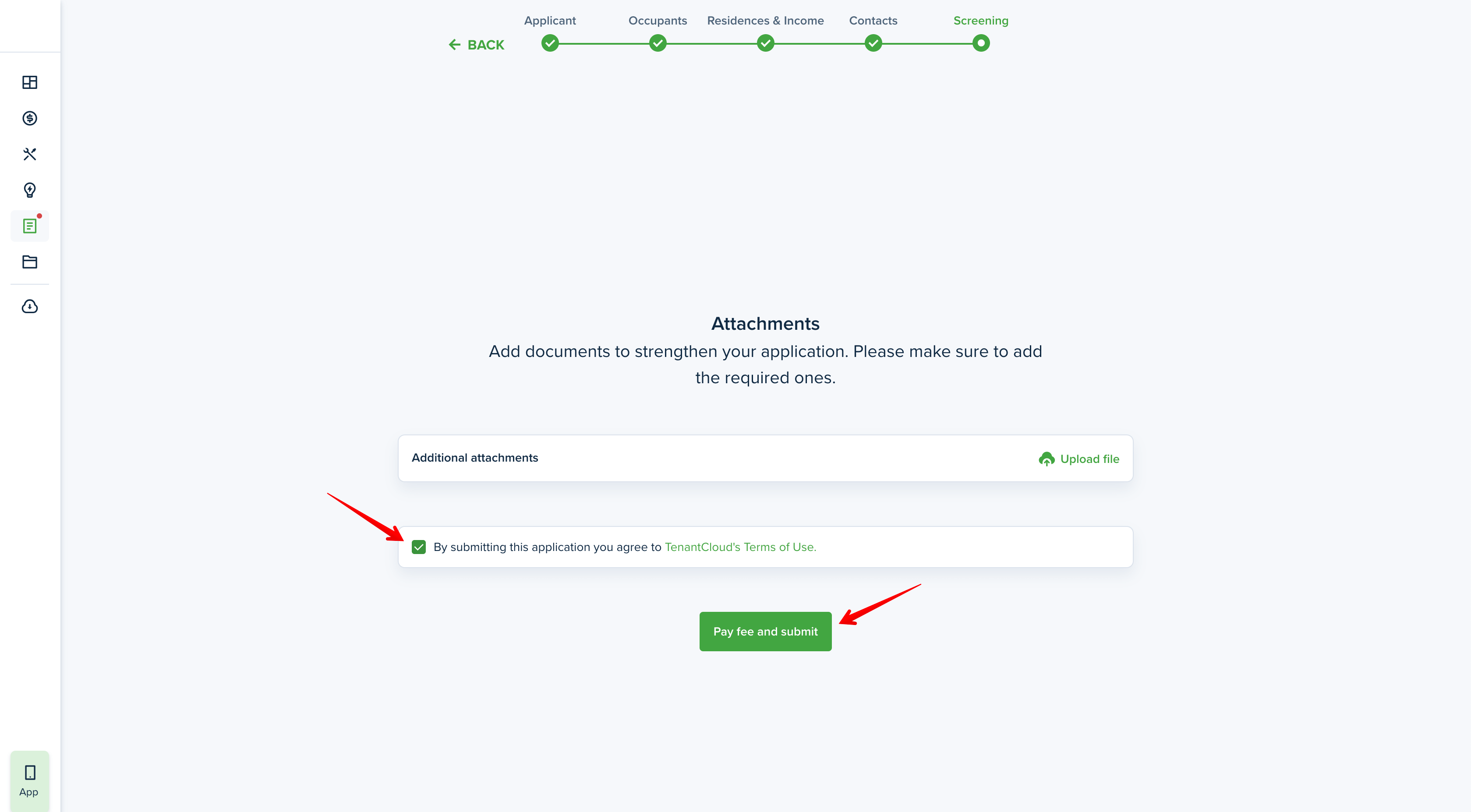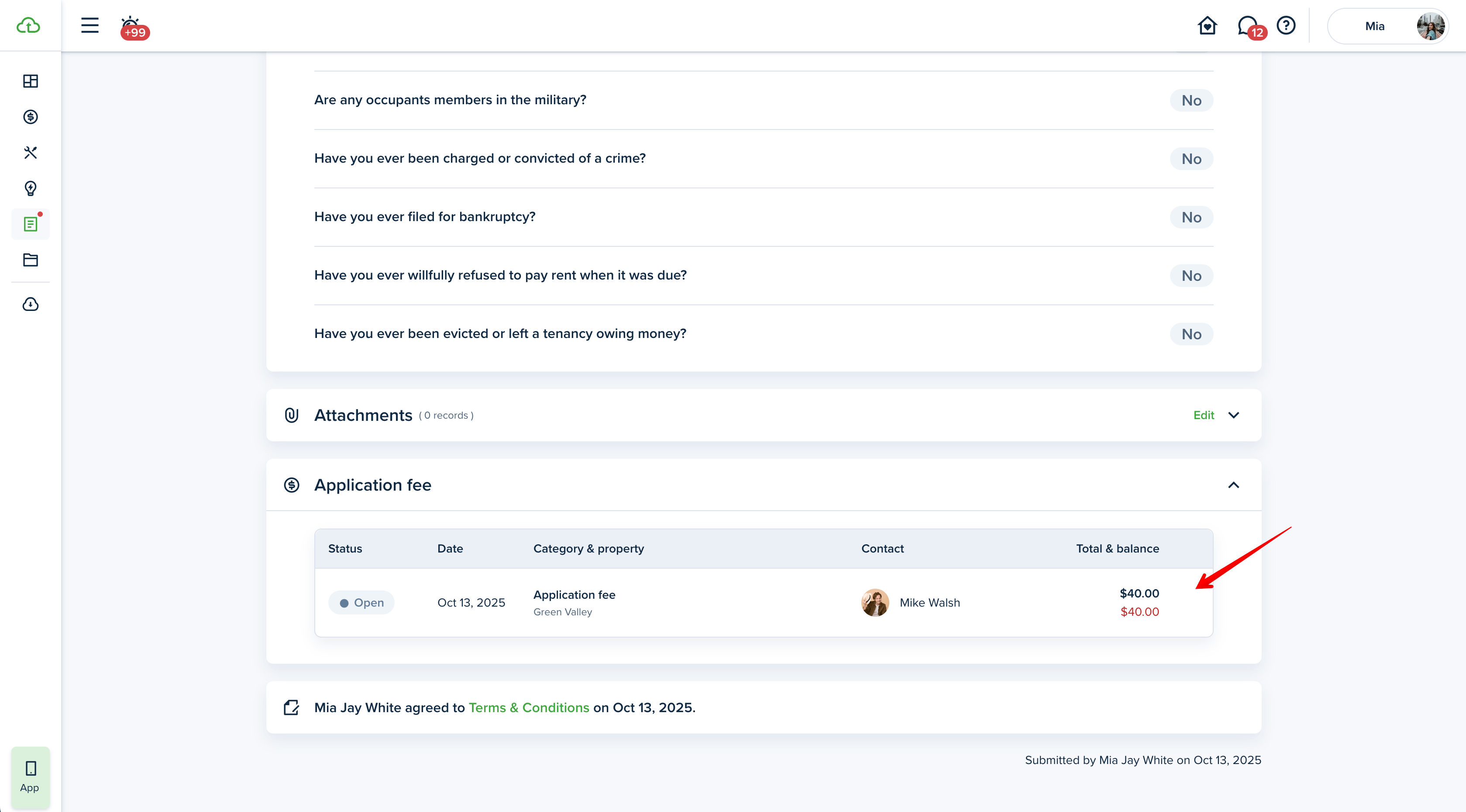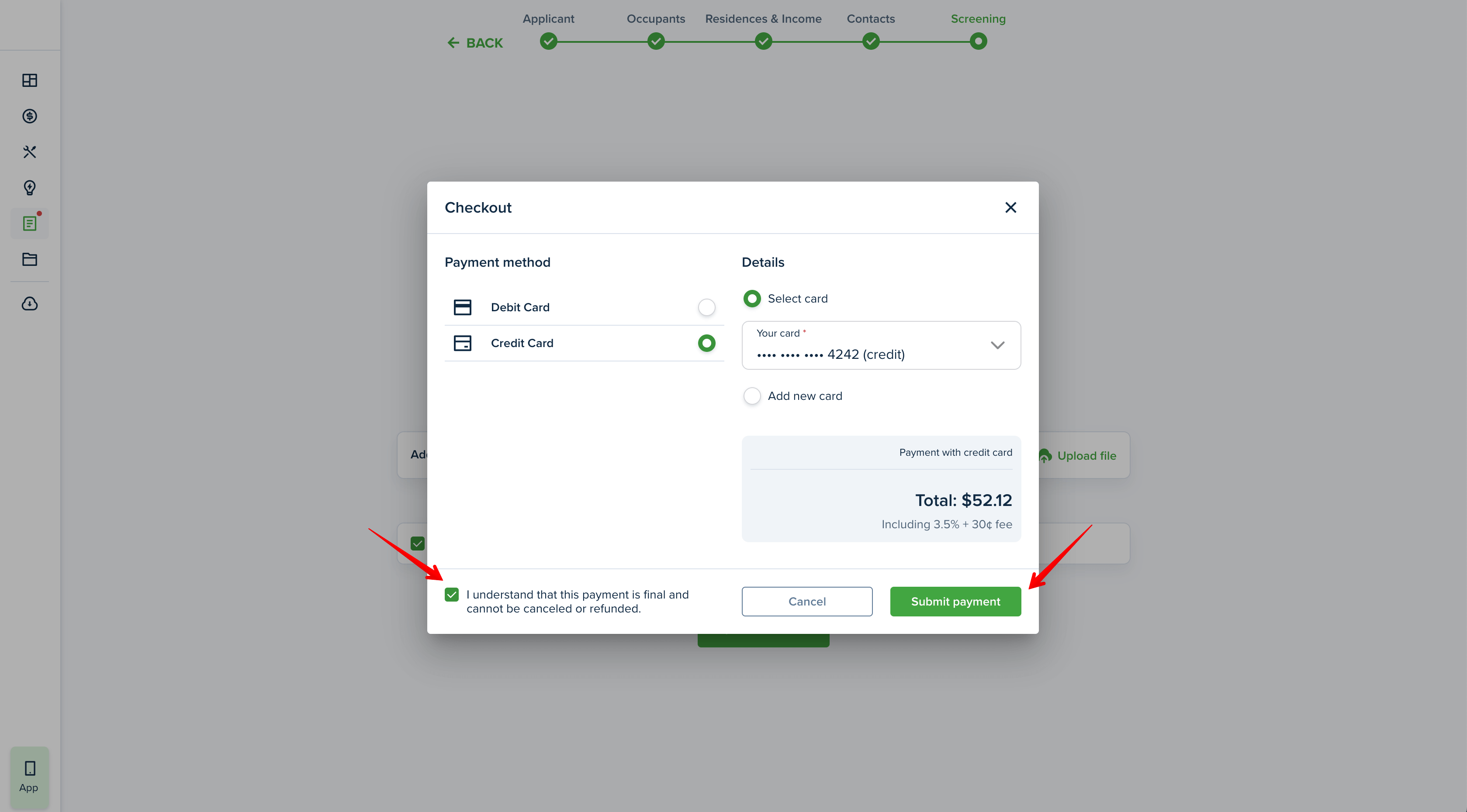 If an application fee is required, pay it using your credit/debit card. If your potential landlord has successfully set up Online Payments on their end, you can submit a payment by pressing the "Submit payment" button.