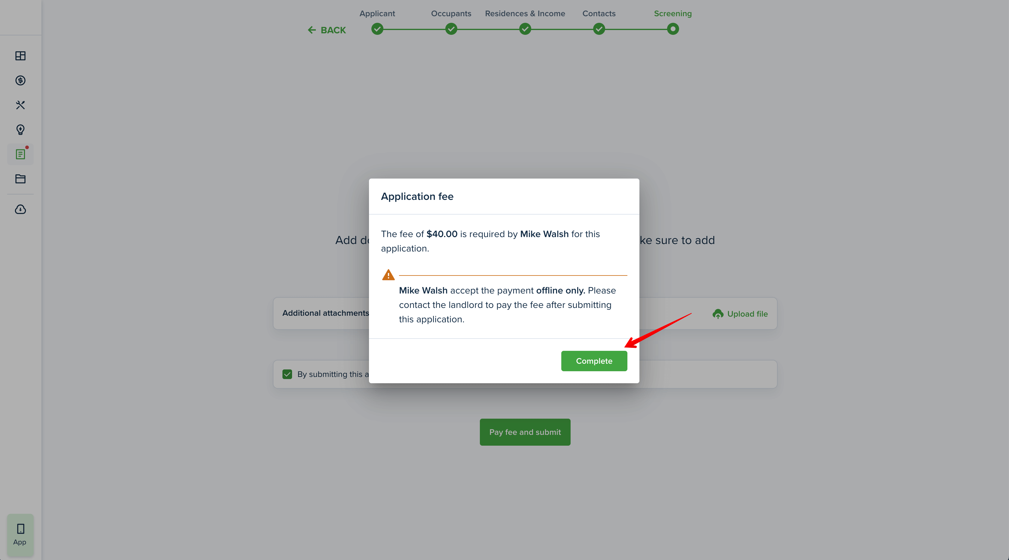 After you submit the payment outside the system, the landlord will want to mark your application fee invoice as paid on their end.