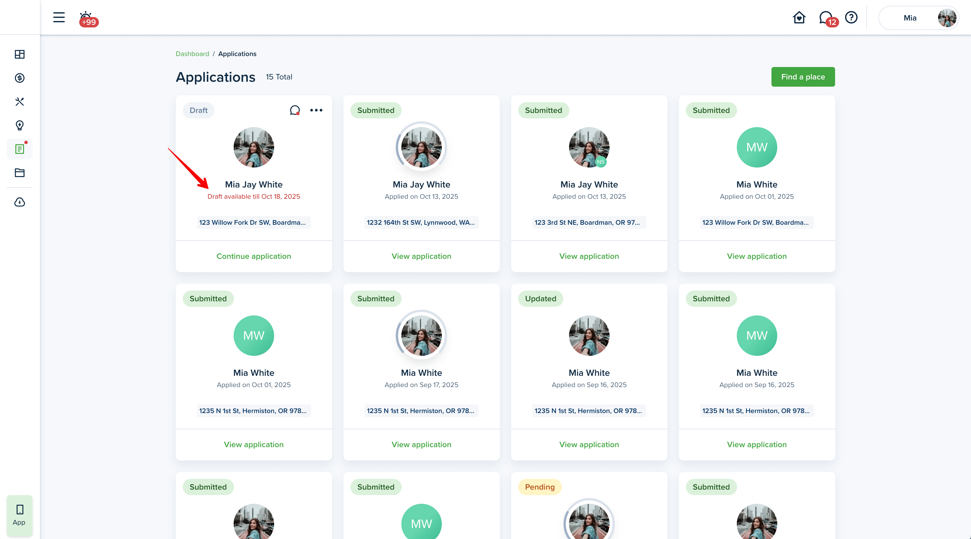 The applications in “Draft” status are available for 5 days. If no updates are made and the application is not submitted, it will be removed automatically.
