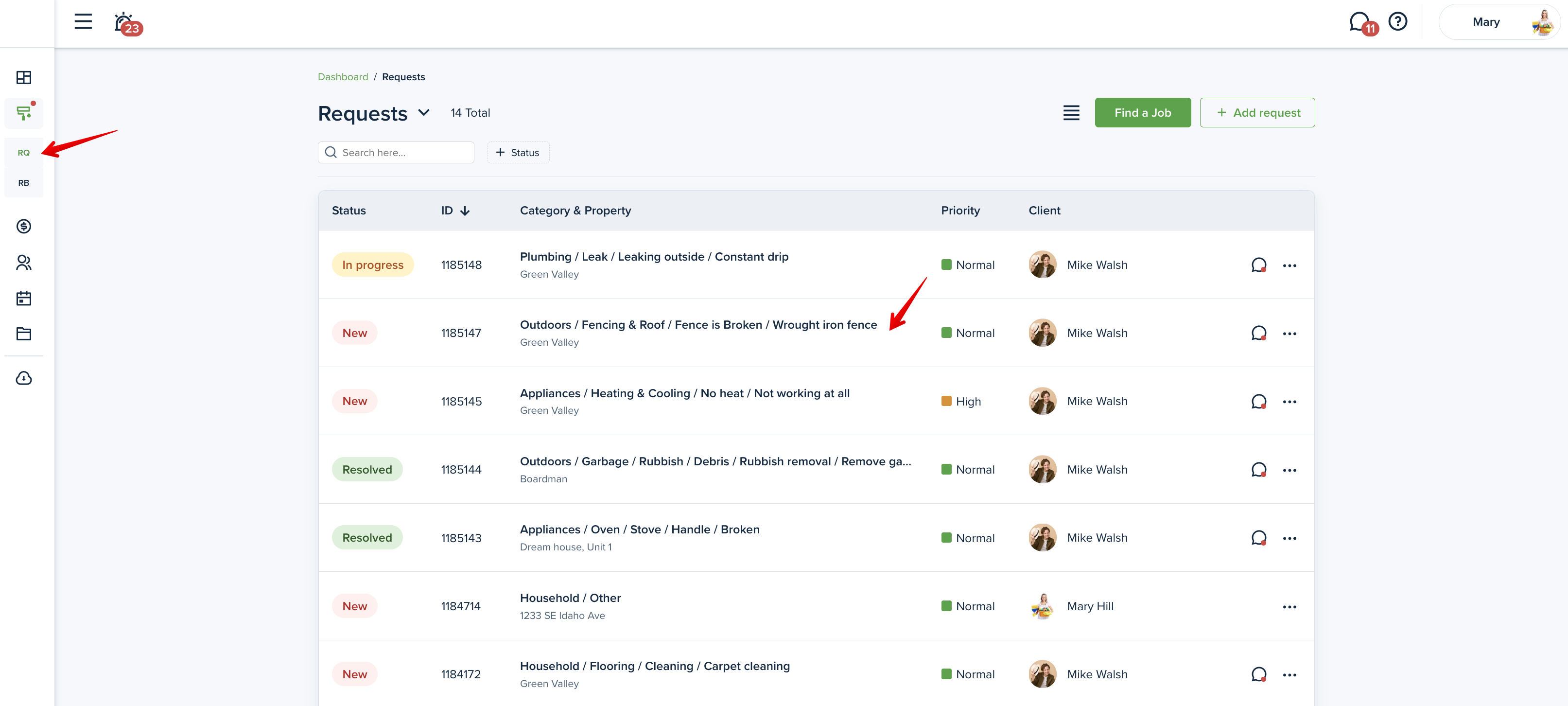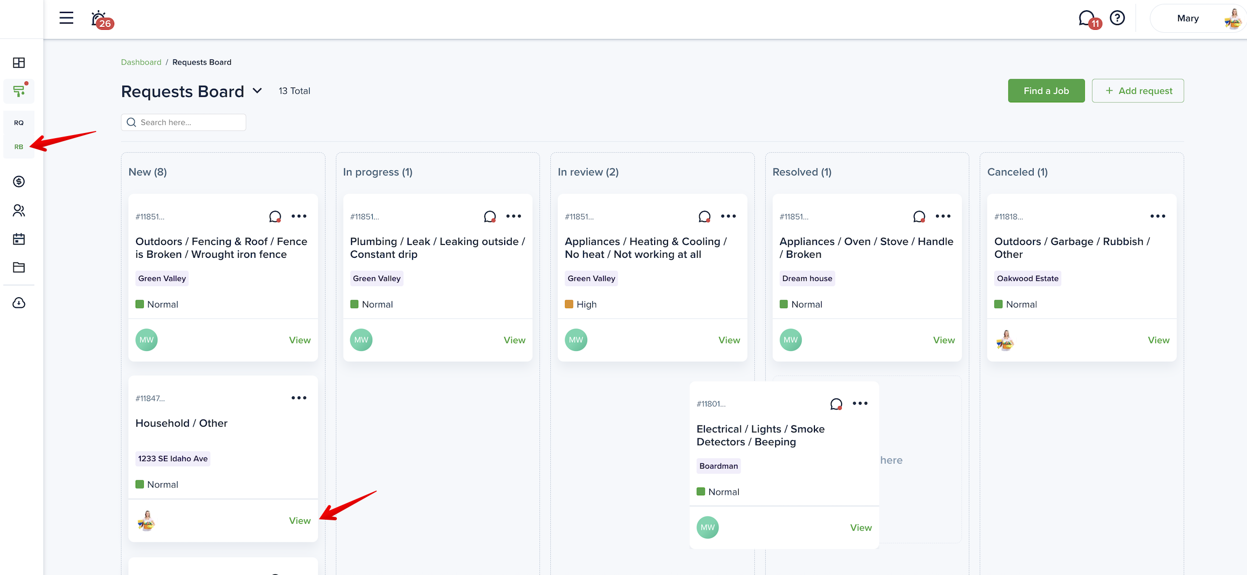 You may also change the status of maintenance requests from the “Requests board.” To do so, please go to the “Requests board” section on the left side menu, click the “View“ link, and change the request status. Alternatively, you can drag a request between columns on the Requests Board to change the status.