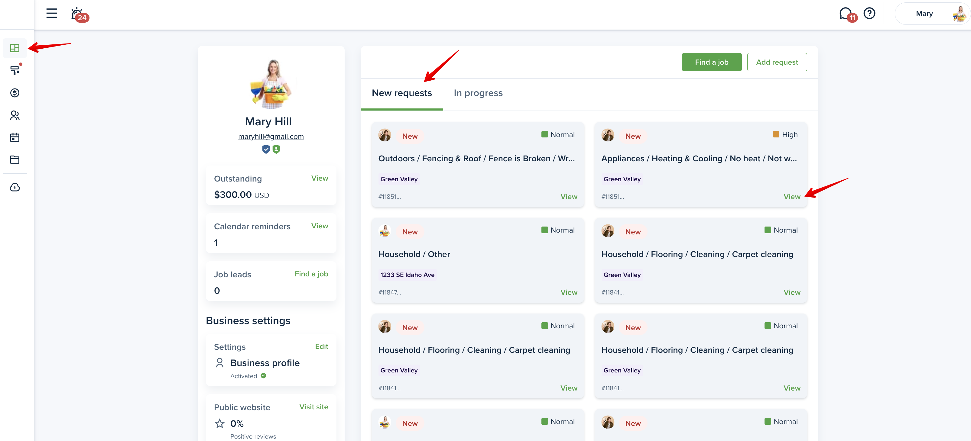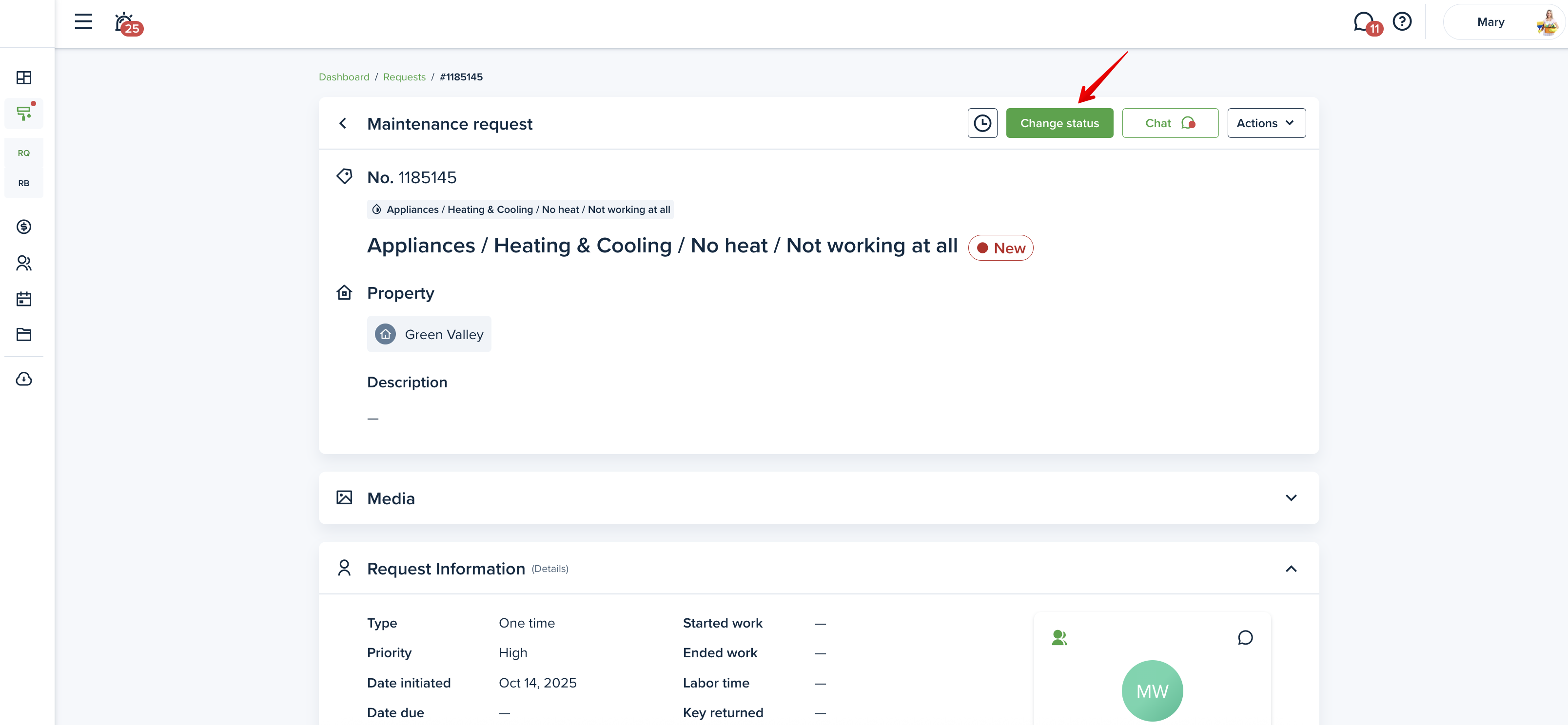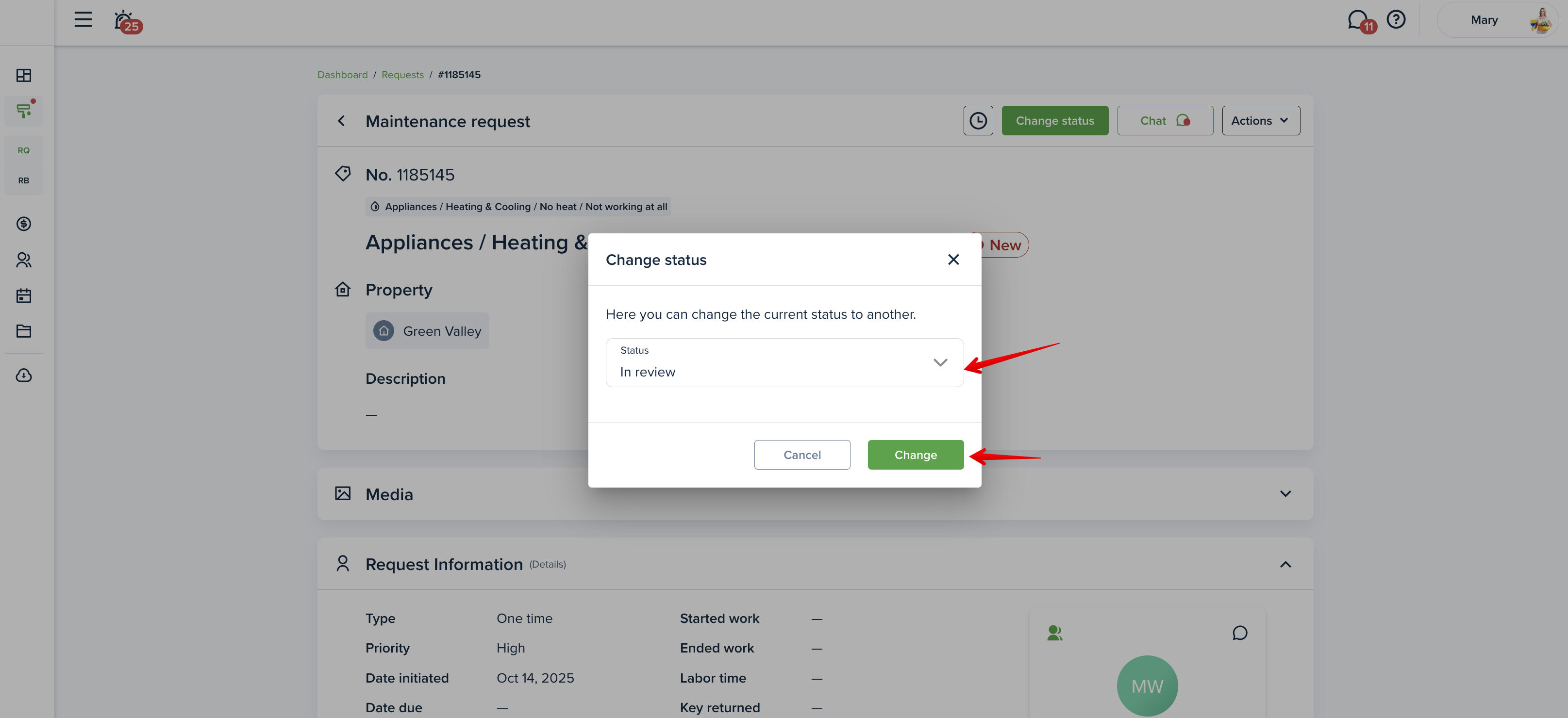 Maintenance requests in “New“ or “In progress” statuses can be updated from the Dashboard. Switch to the needed tab, click View on the request card, and use the Change status button: