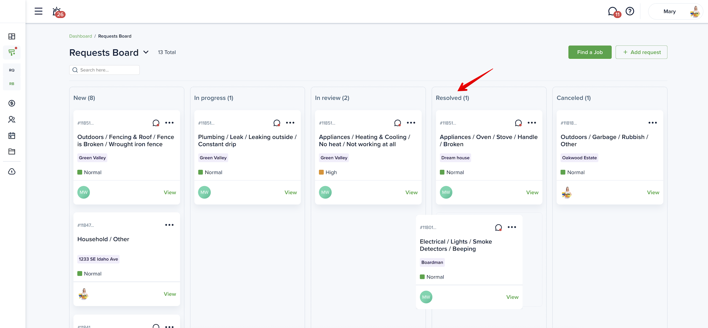If you decide to resolve the maintenance request, select the Resolved status from the list or drag the request to the Resolved column using the “Requests Board”: