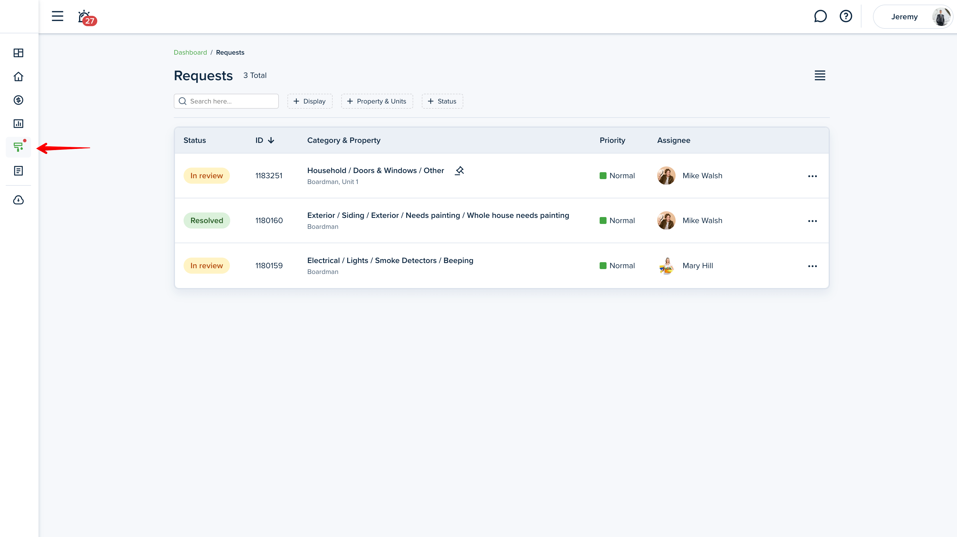 To view shared maintenance requests, go to the Requests page on the left menu of your dashboard. Click on the "View" link to see maintenance request details. From the three dots menu, you may print the request.