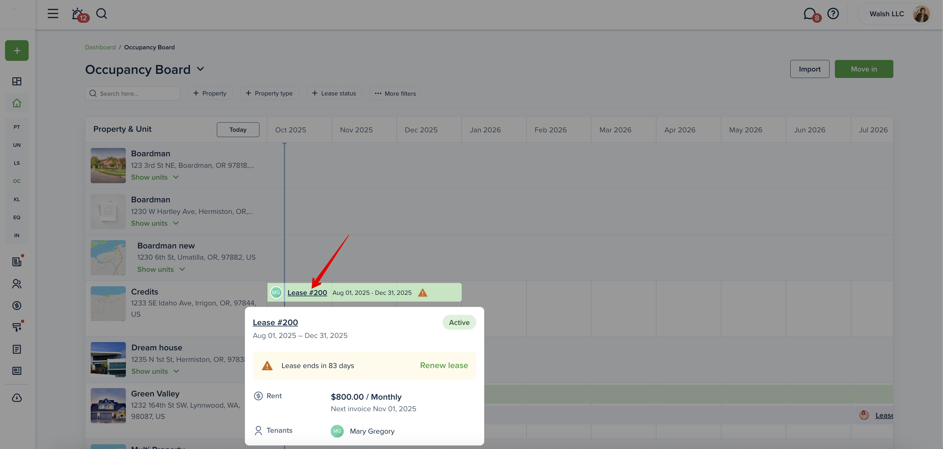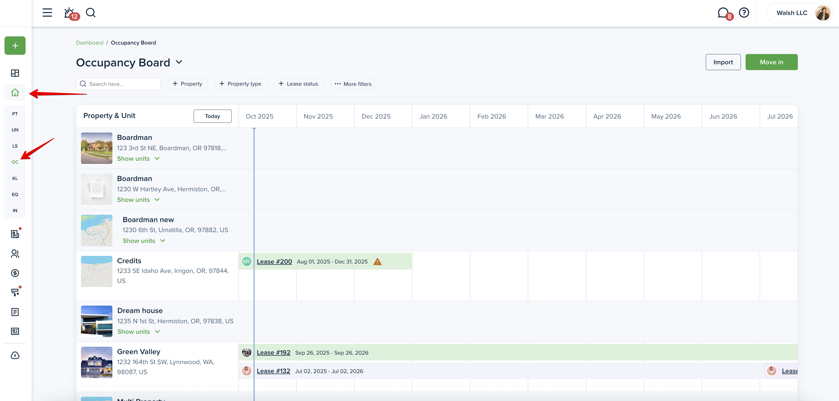 To access all leases in TenantCloud, go to the “Portfolio” page from your dashboard's left menu and select “Occupancy Board”. Switch the page view between Leases, which displays leases in a list, or Occupancy Board, which shows a simple, color-coded timeline with every move-in, move-out, and renewal opportunity at a glance.