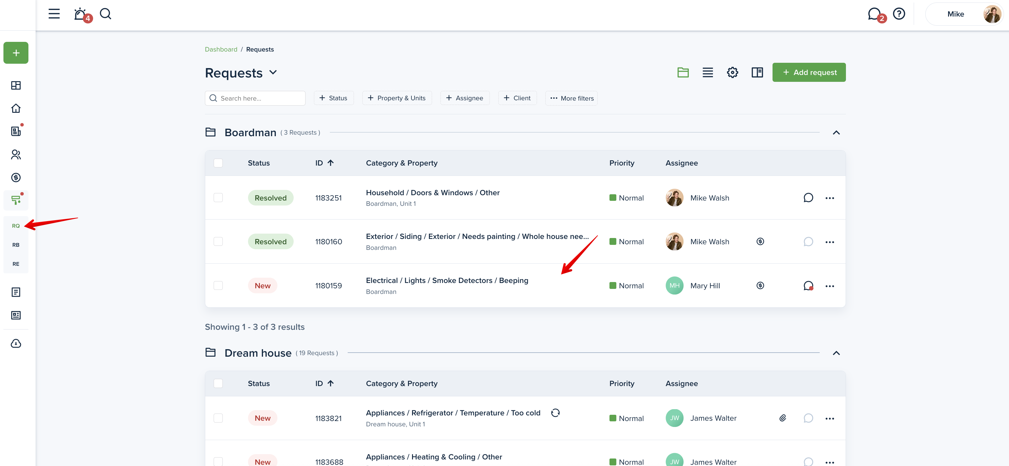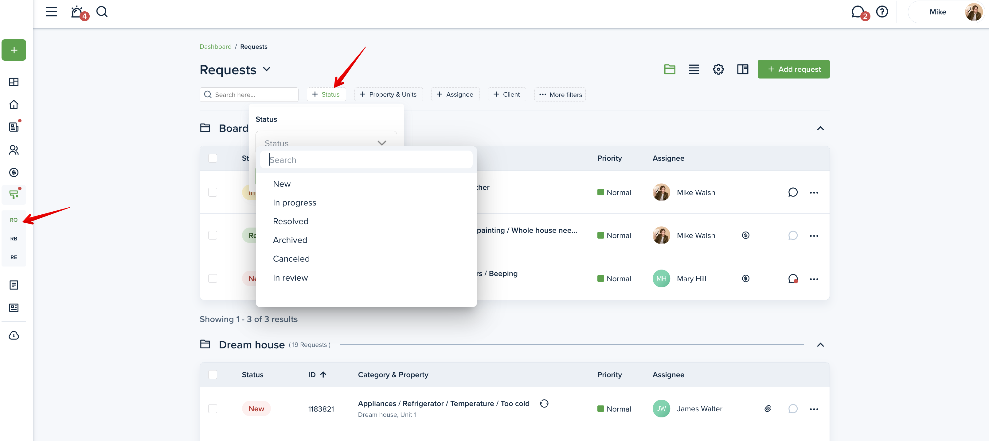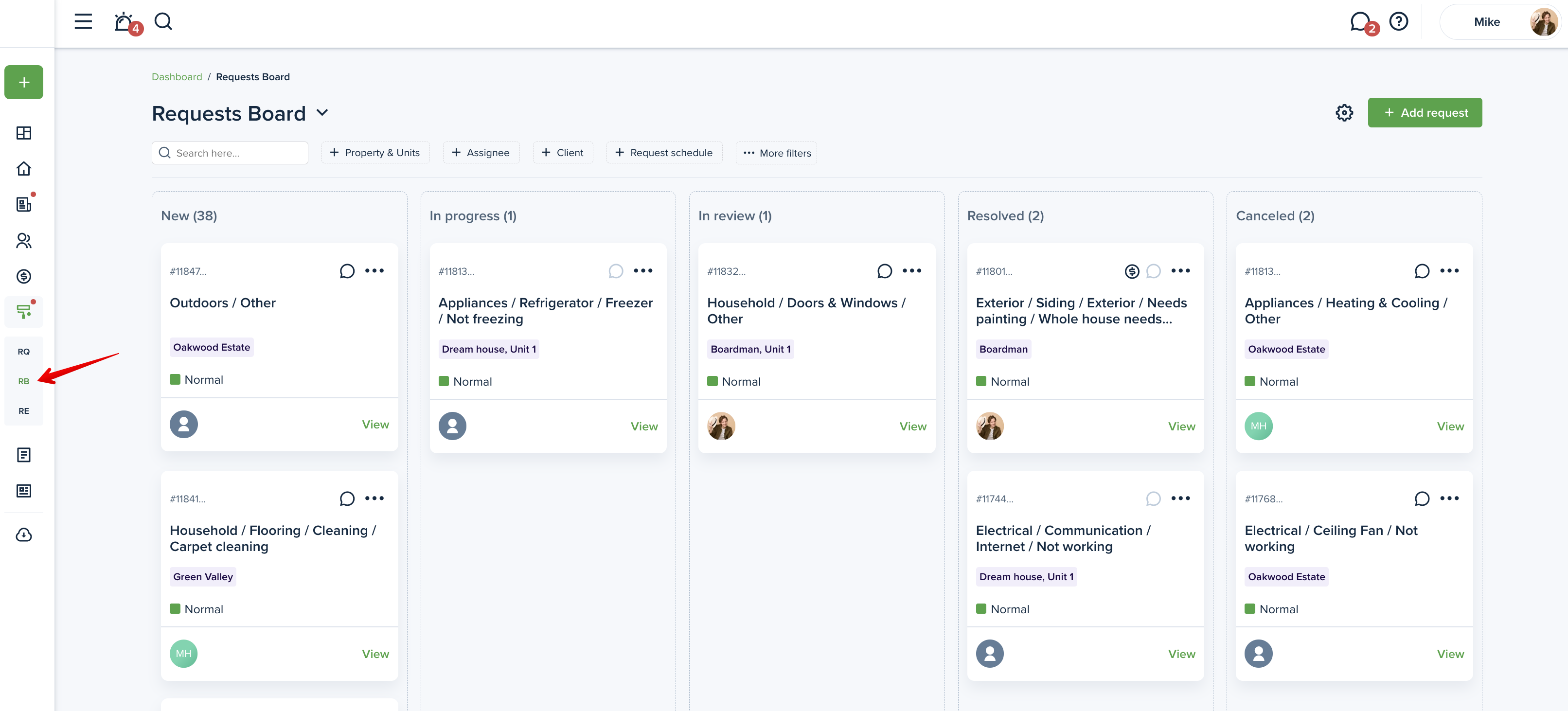 To change the status of a maintenance request, please go to the "Requests" page from your left-side menu and click on the desired request to change its status: