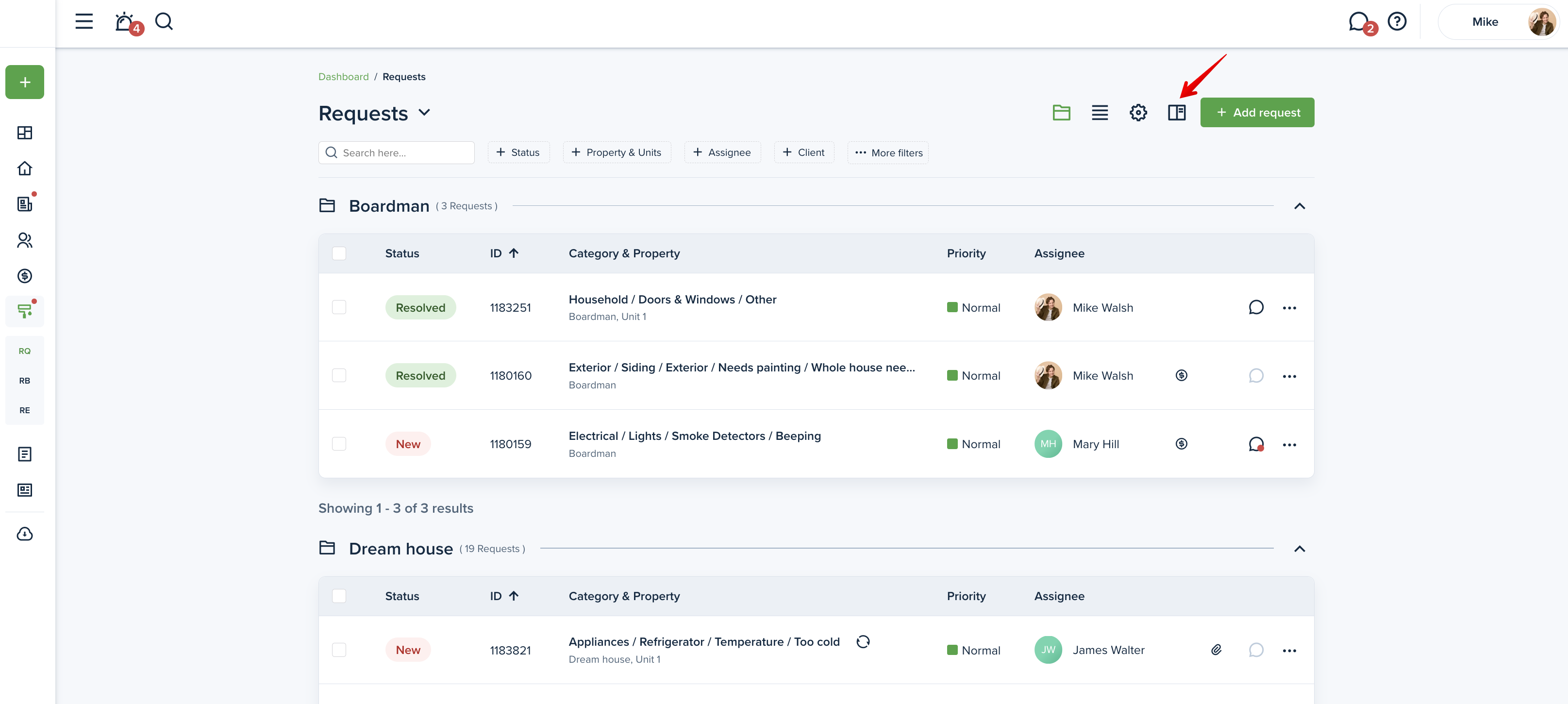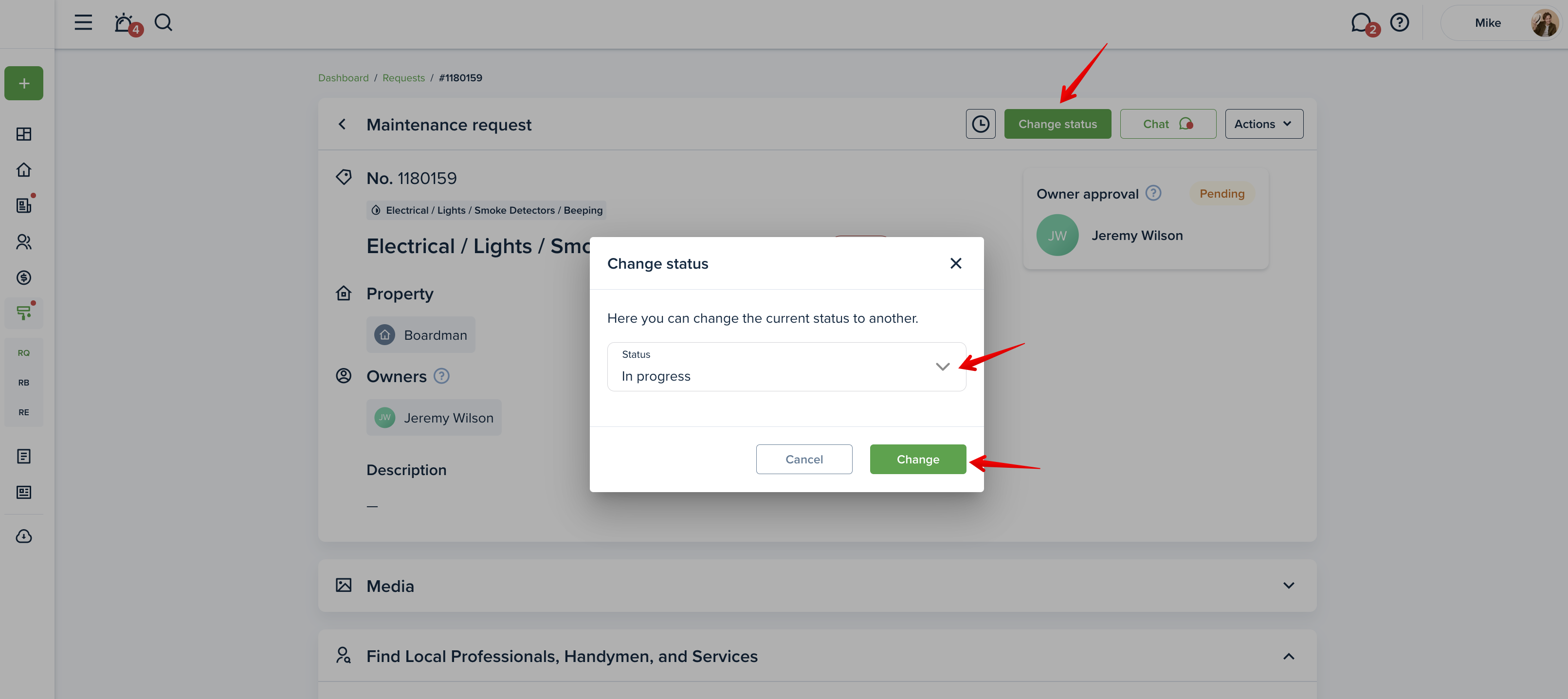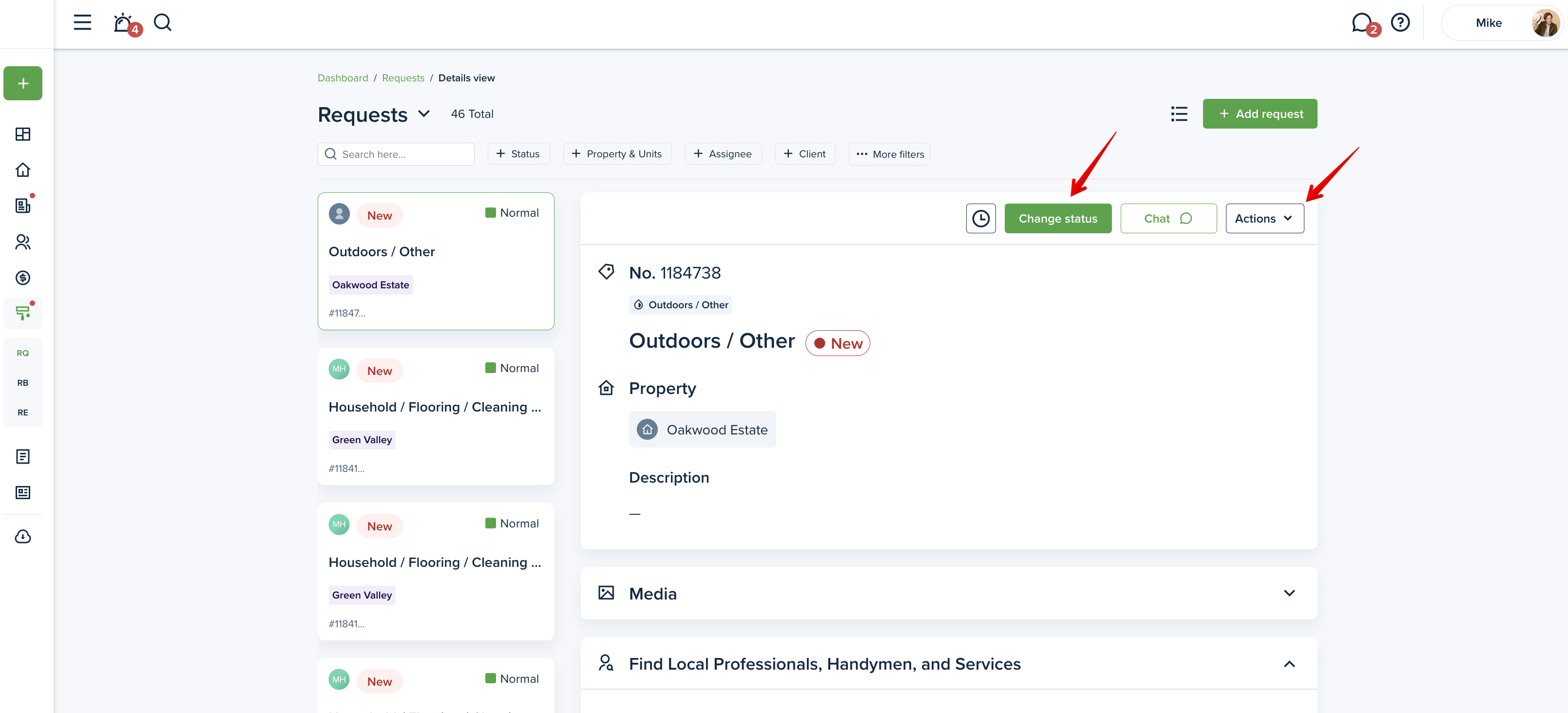 To change the status of a maintenance request, please go to the "Requests" page from your left-side menu and click on the desired request to change its status: