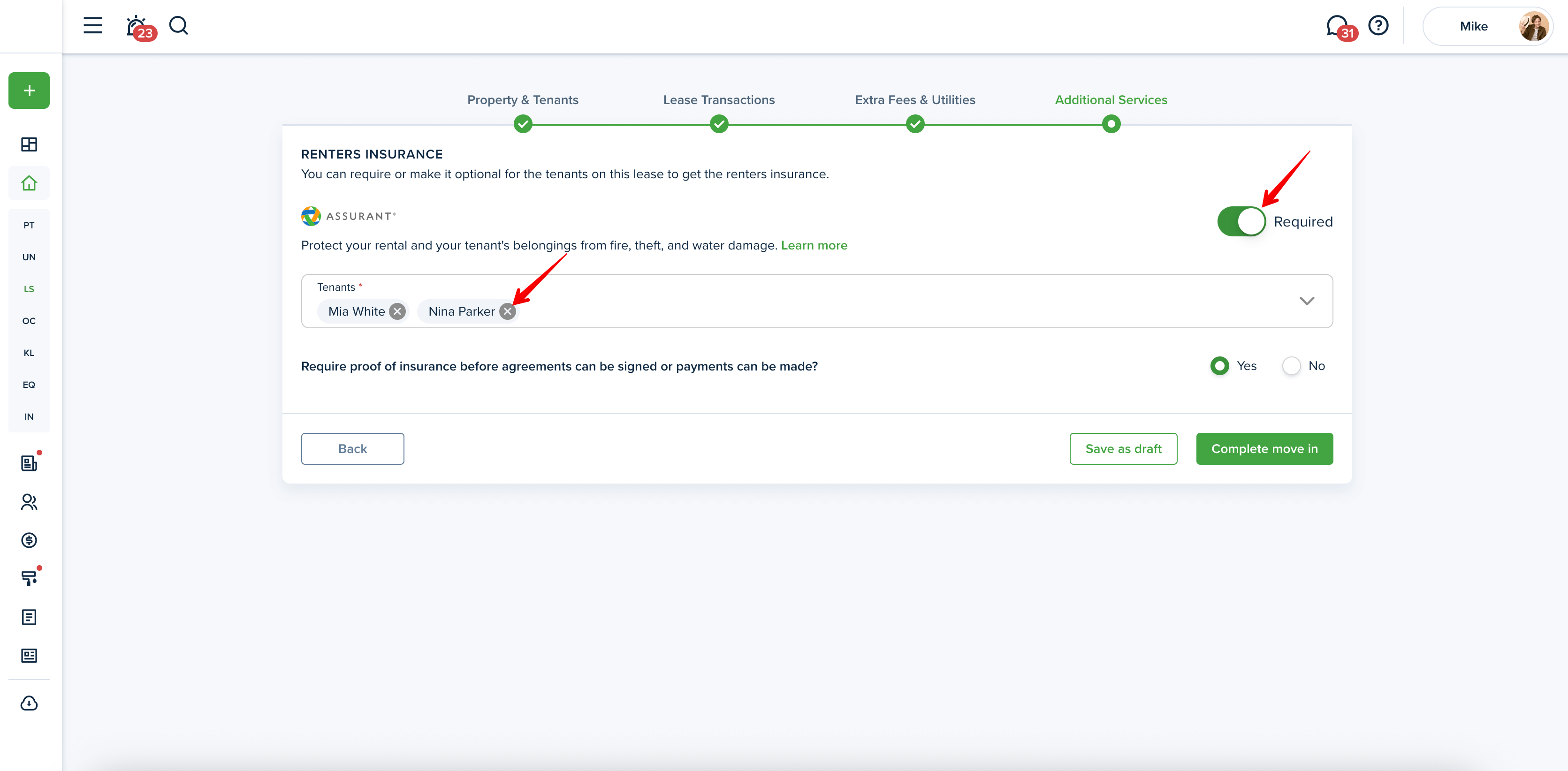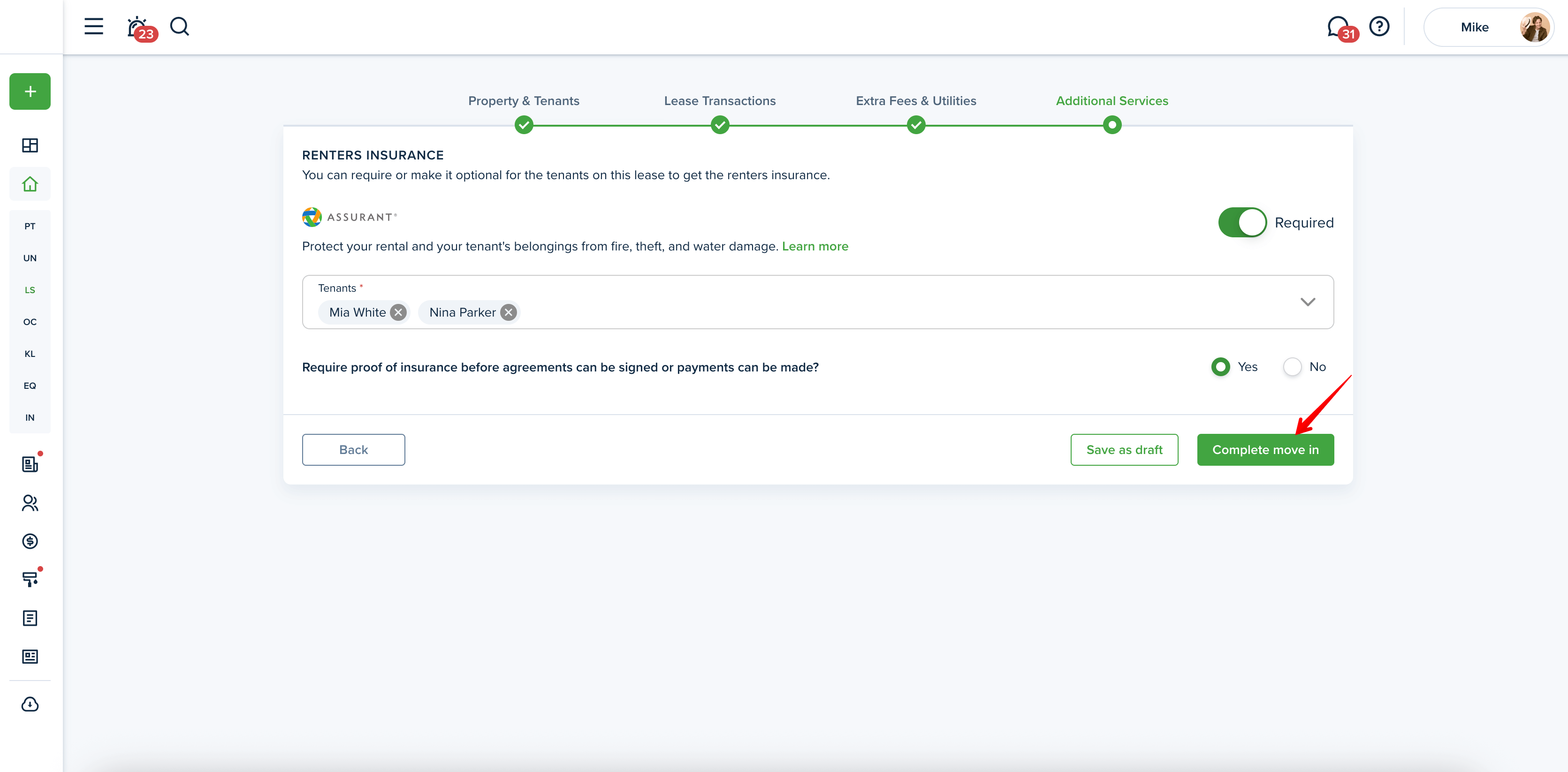If you don't want your tenants to purchase Renters Insurance, you can switch off this option and click on the “Complete move in” button to create a lease without Renters Insurance:
