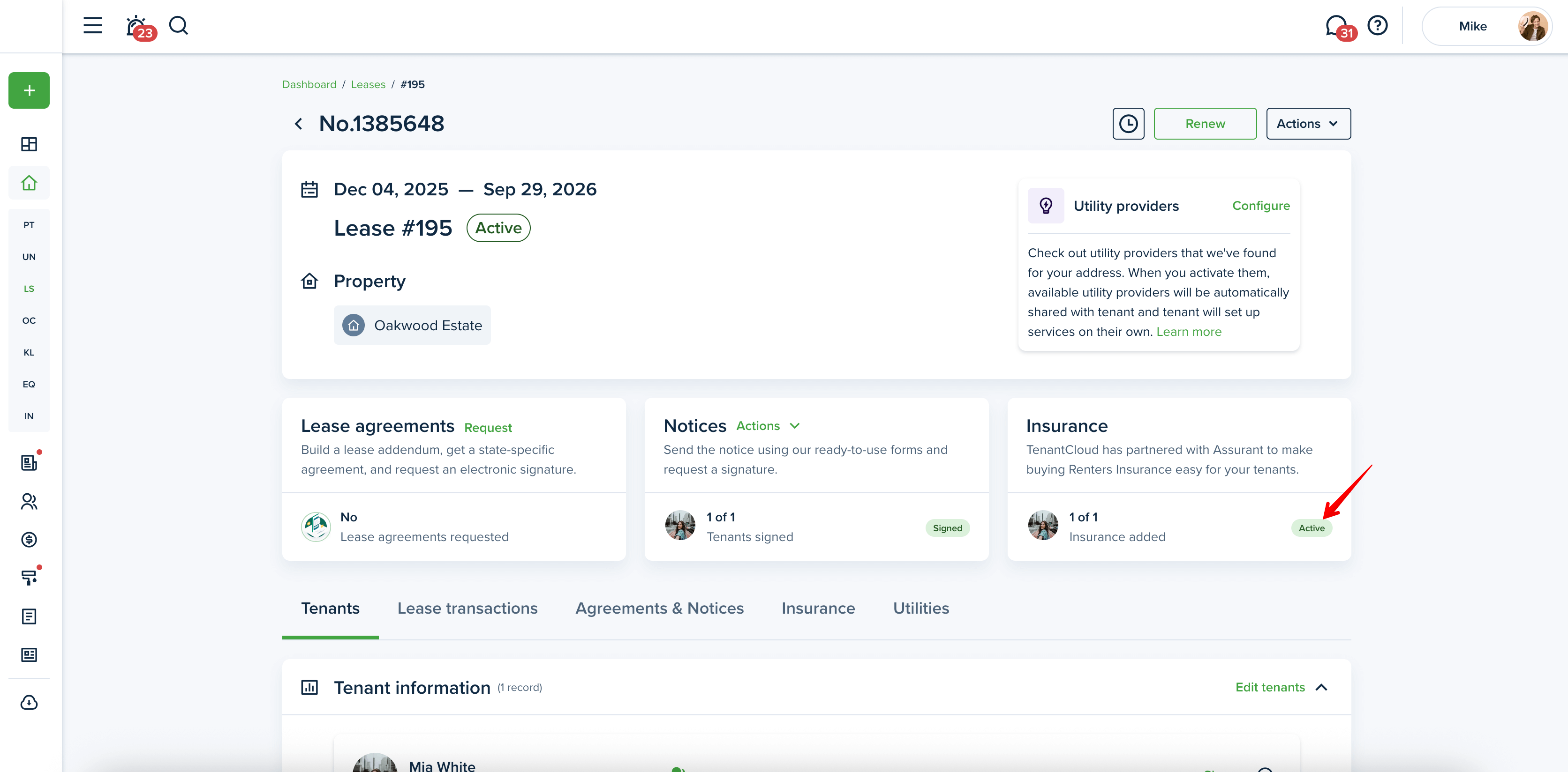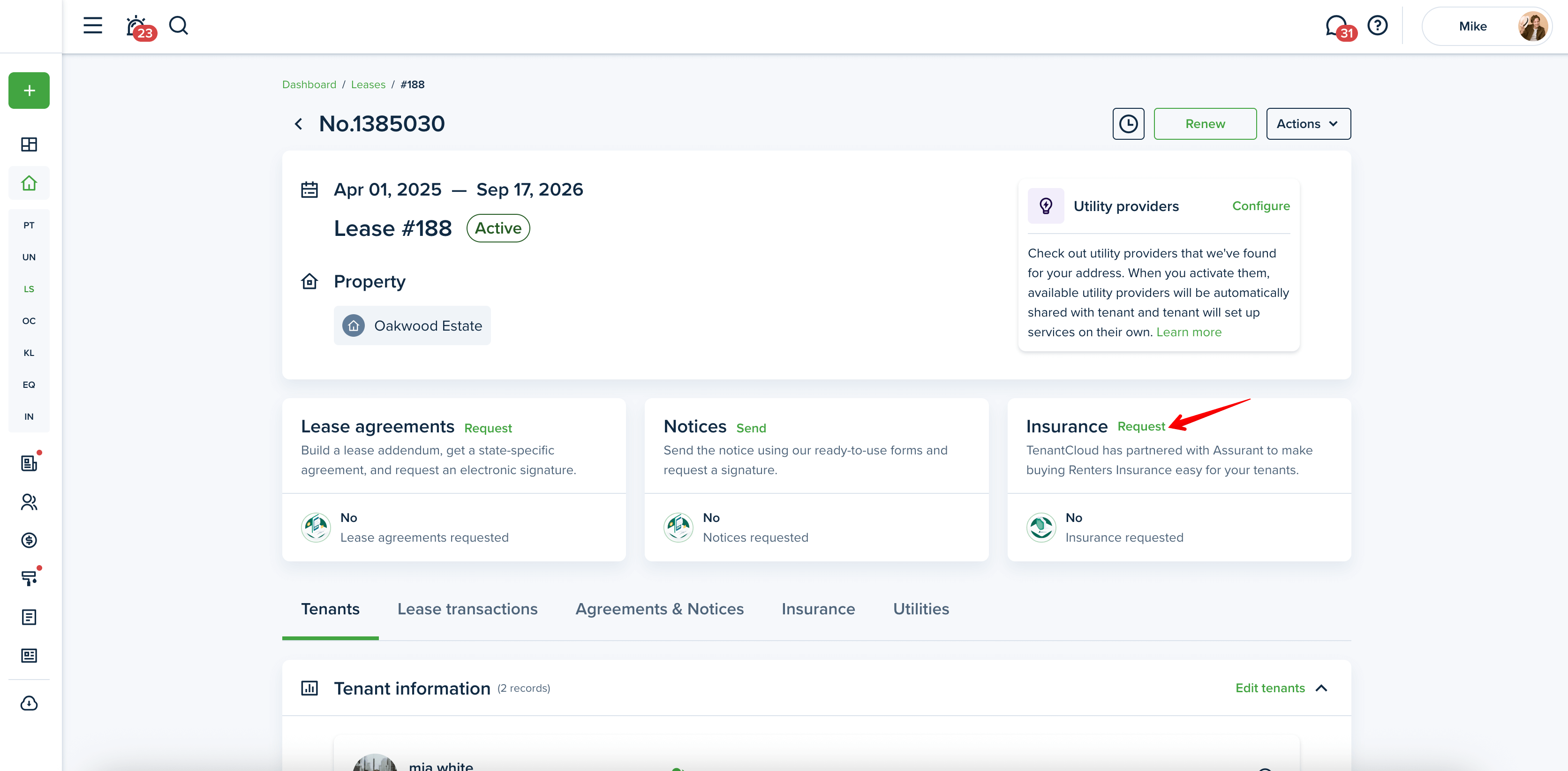 You can also request insurance after the lease becomes active. To do so, open the lease and click on the “Request“ link in the “Insurance” section.