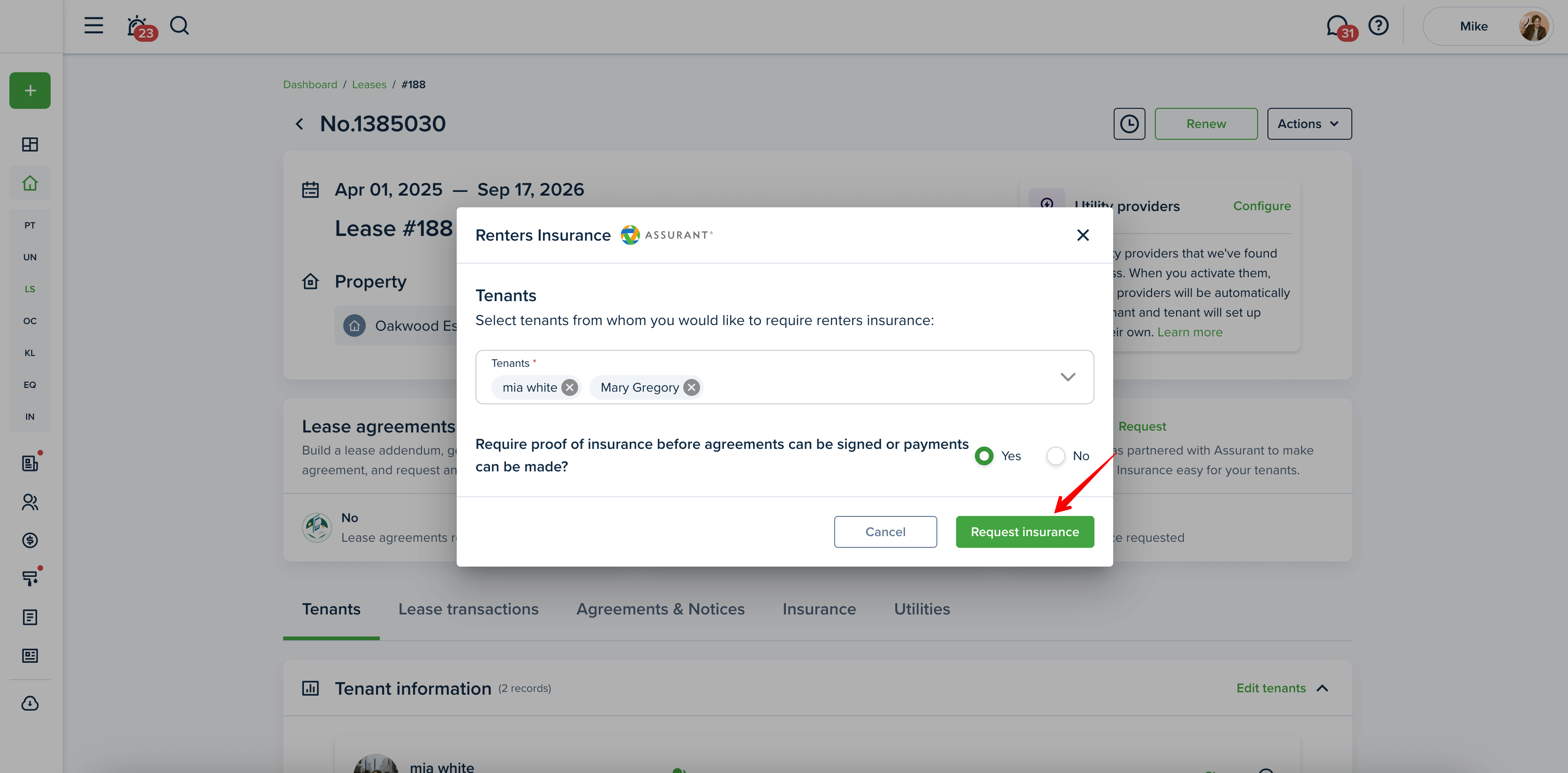 Please note that you cannot request insurance if the lease is the draft status or has ended.