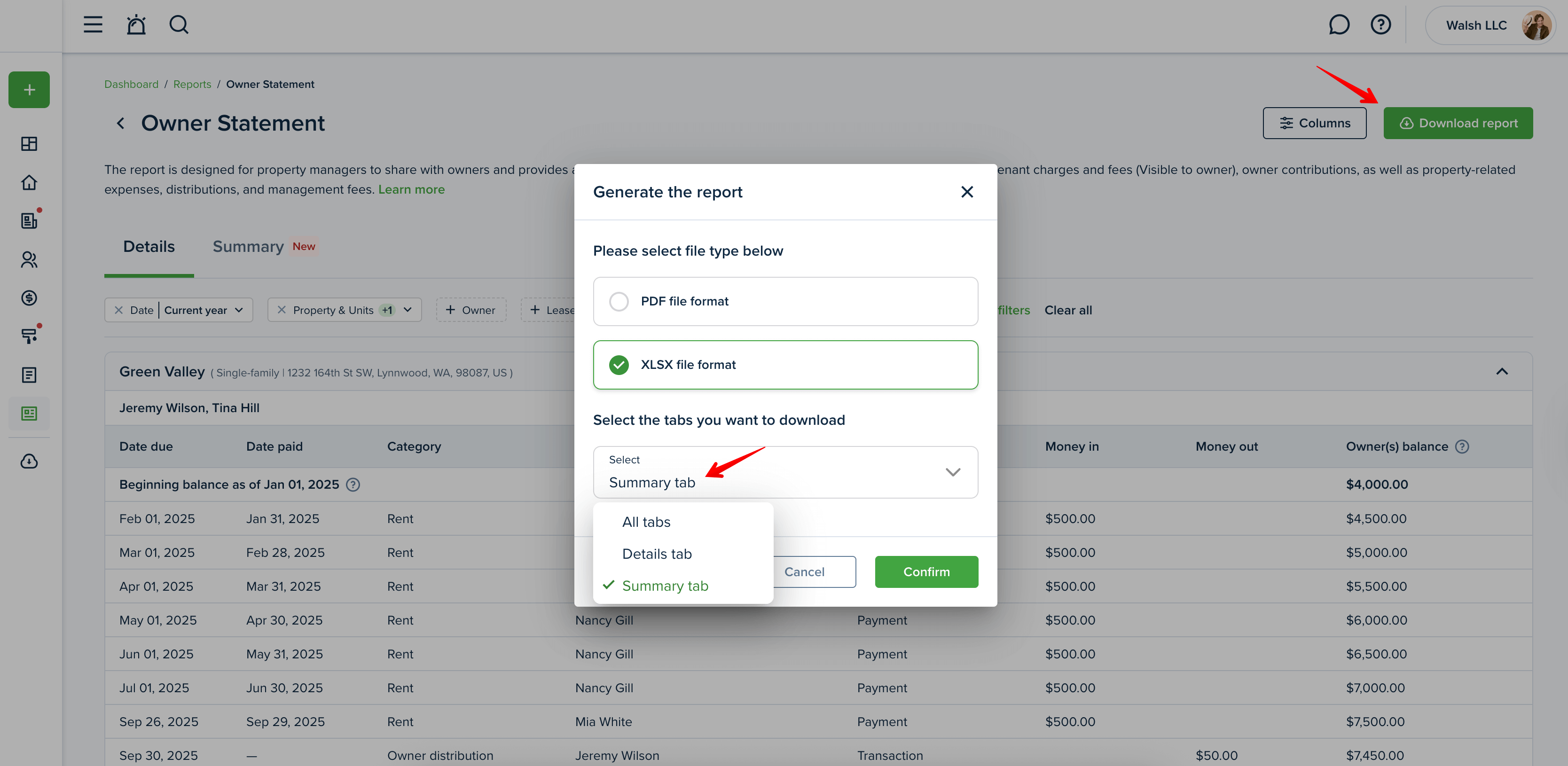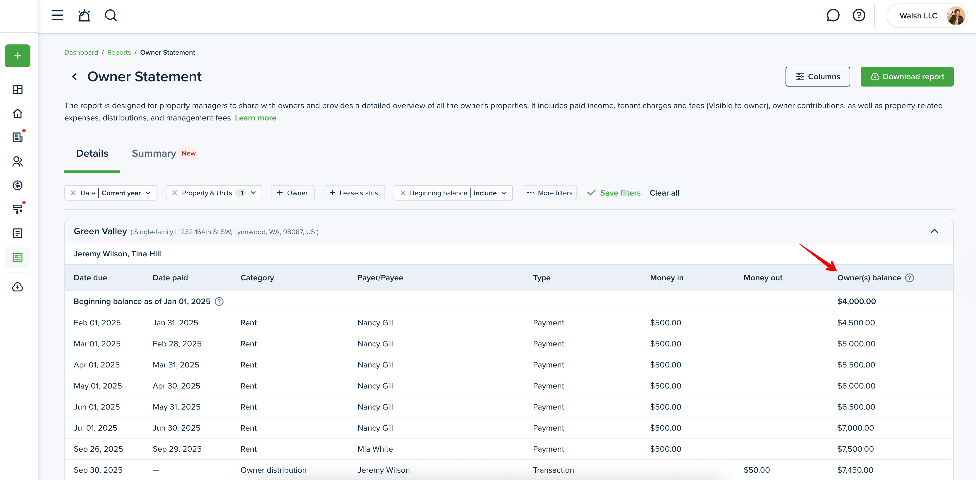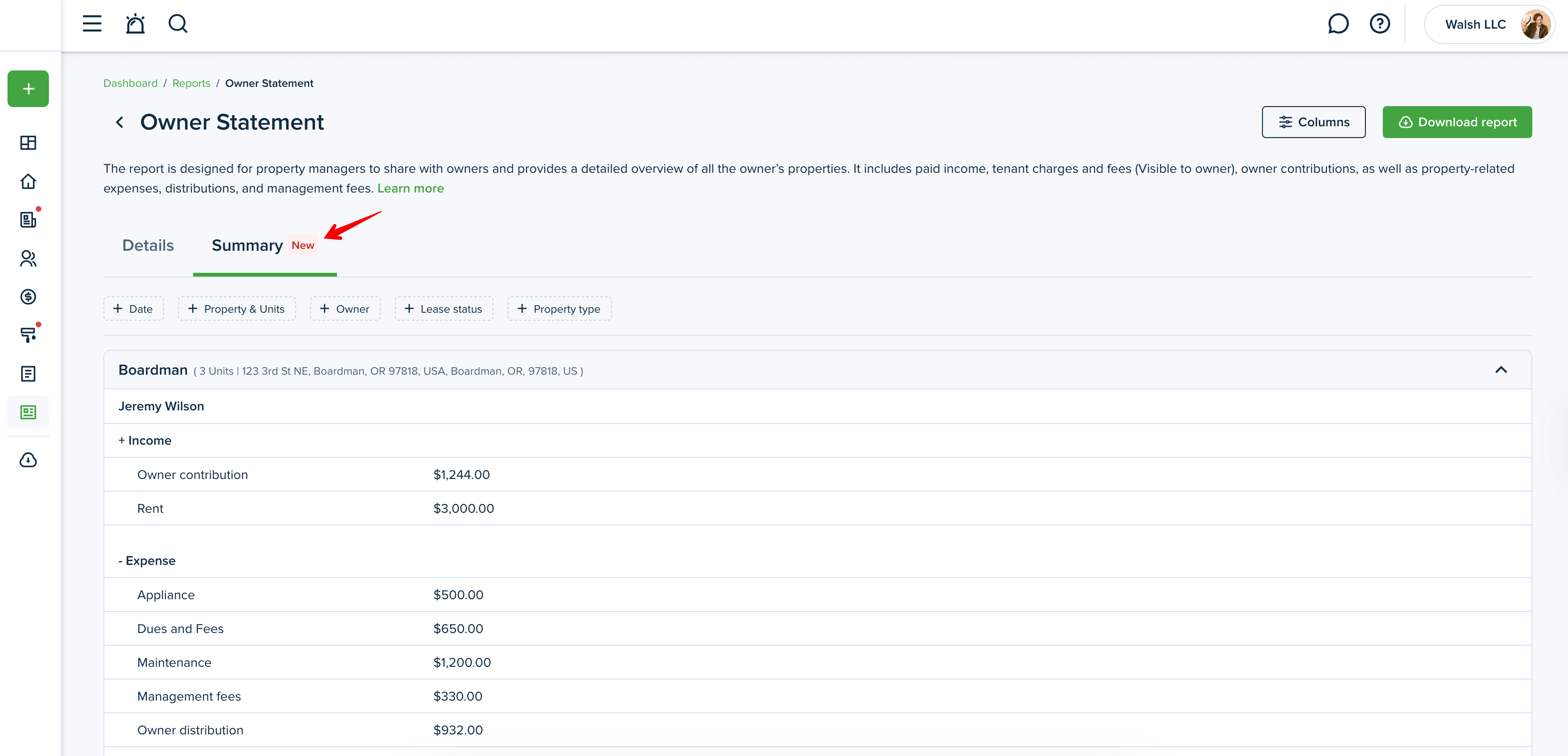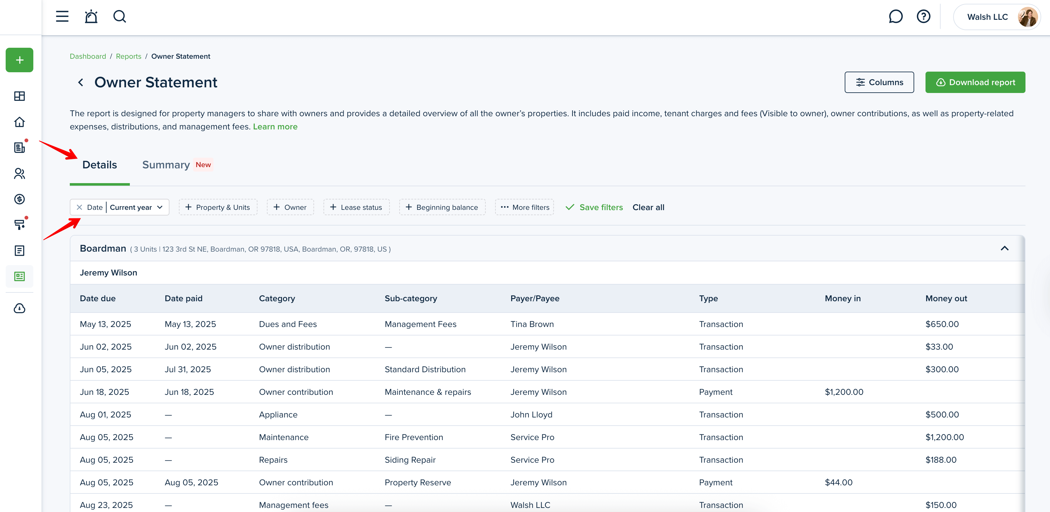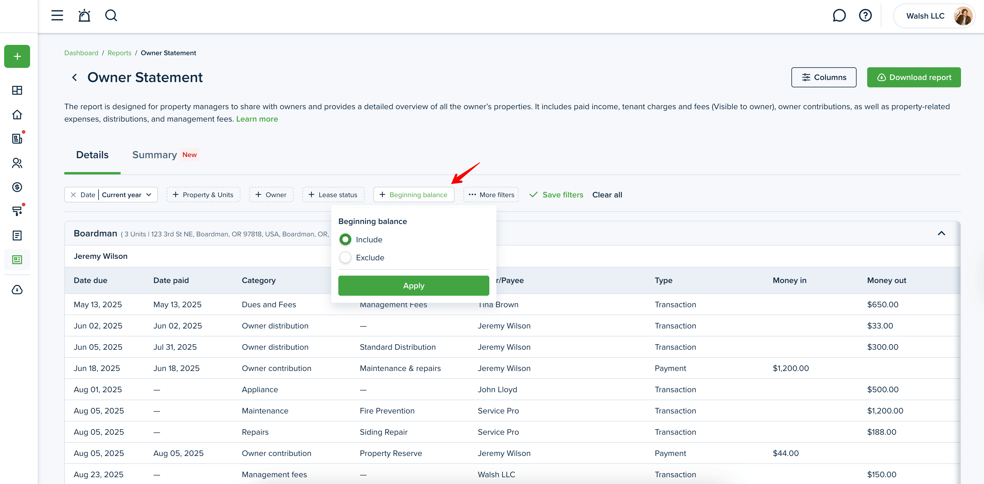 Click the "Download report" button at the top right corner to generate the Owner Statement report.
