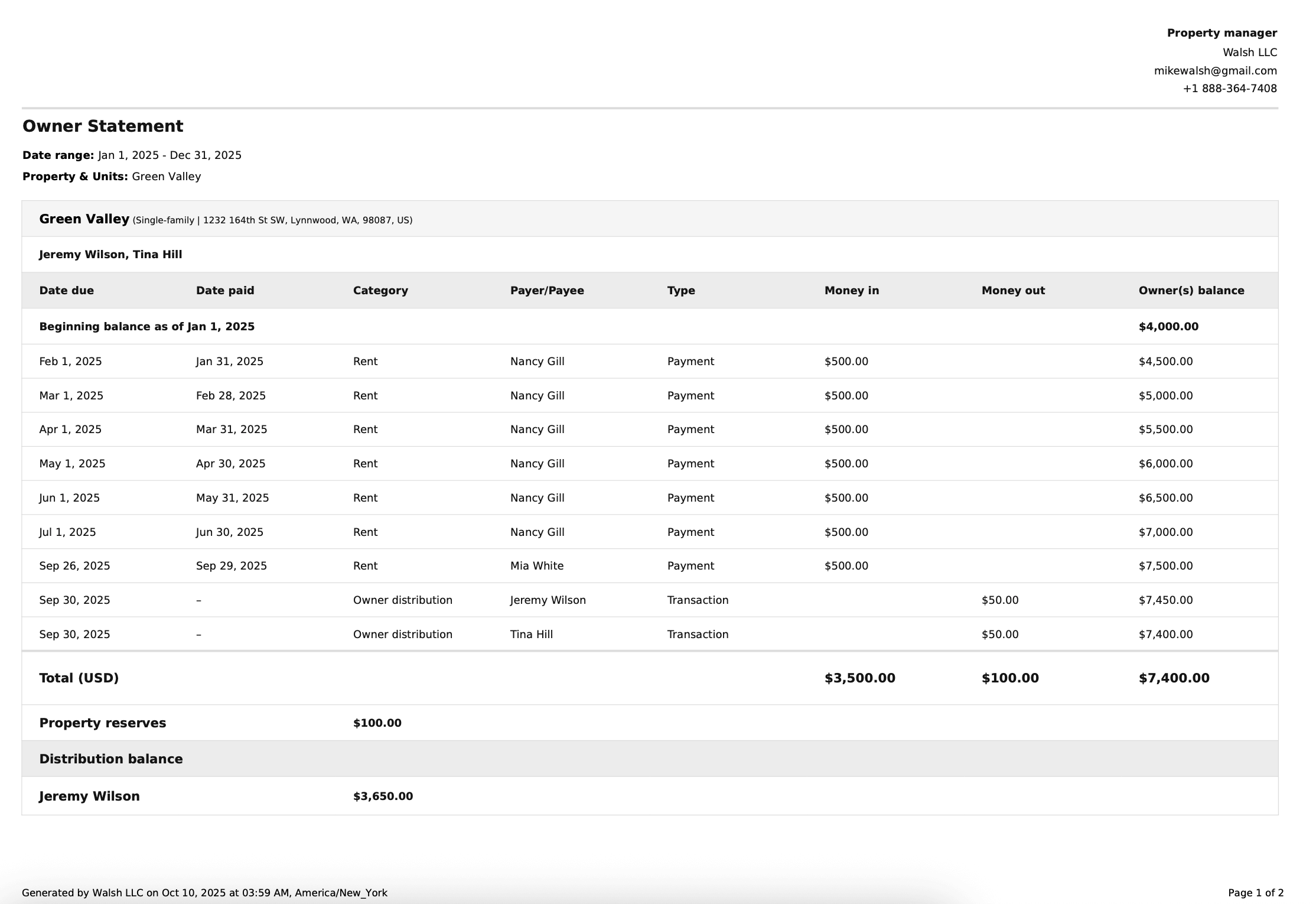 The Owner Statement report is the most effective monthly summary report to share with rental property owners. It helps you: