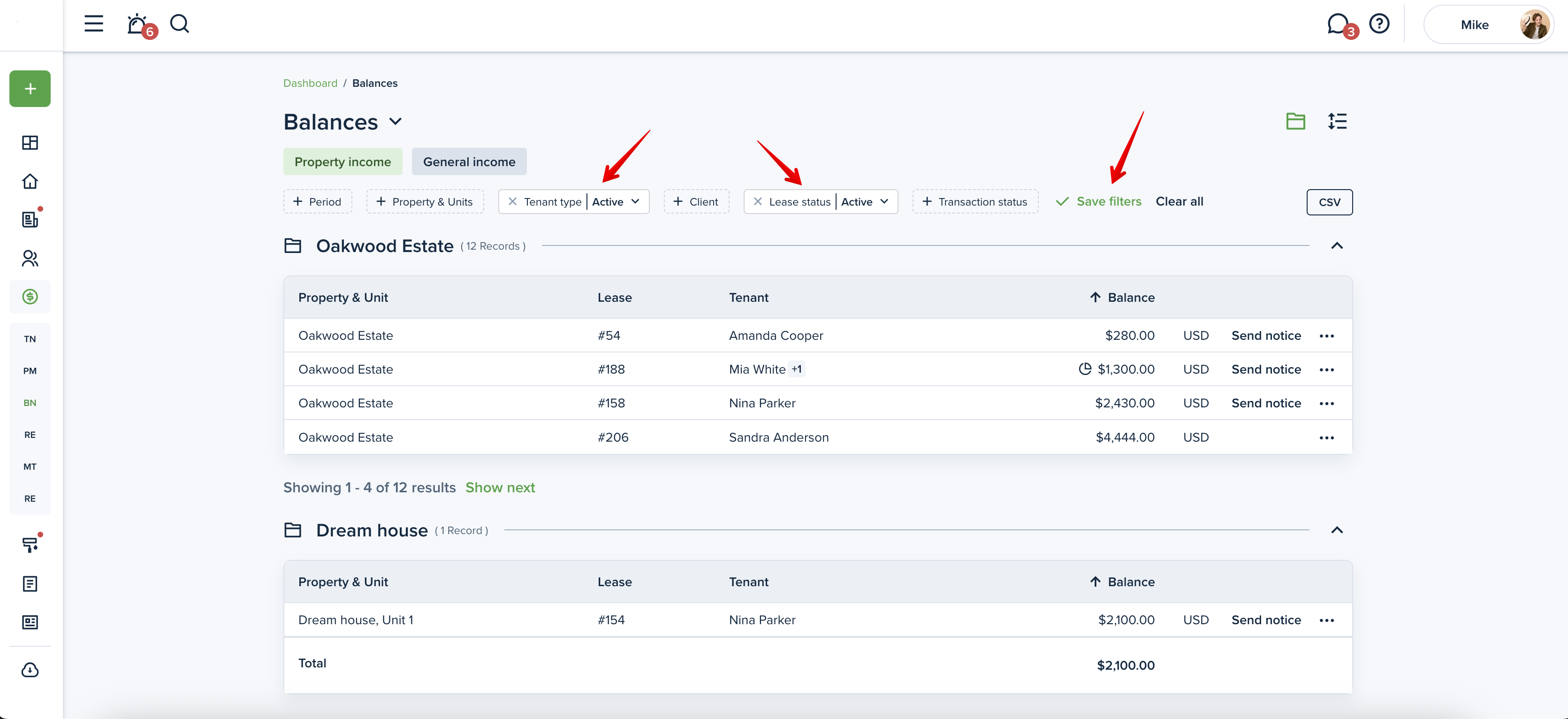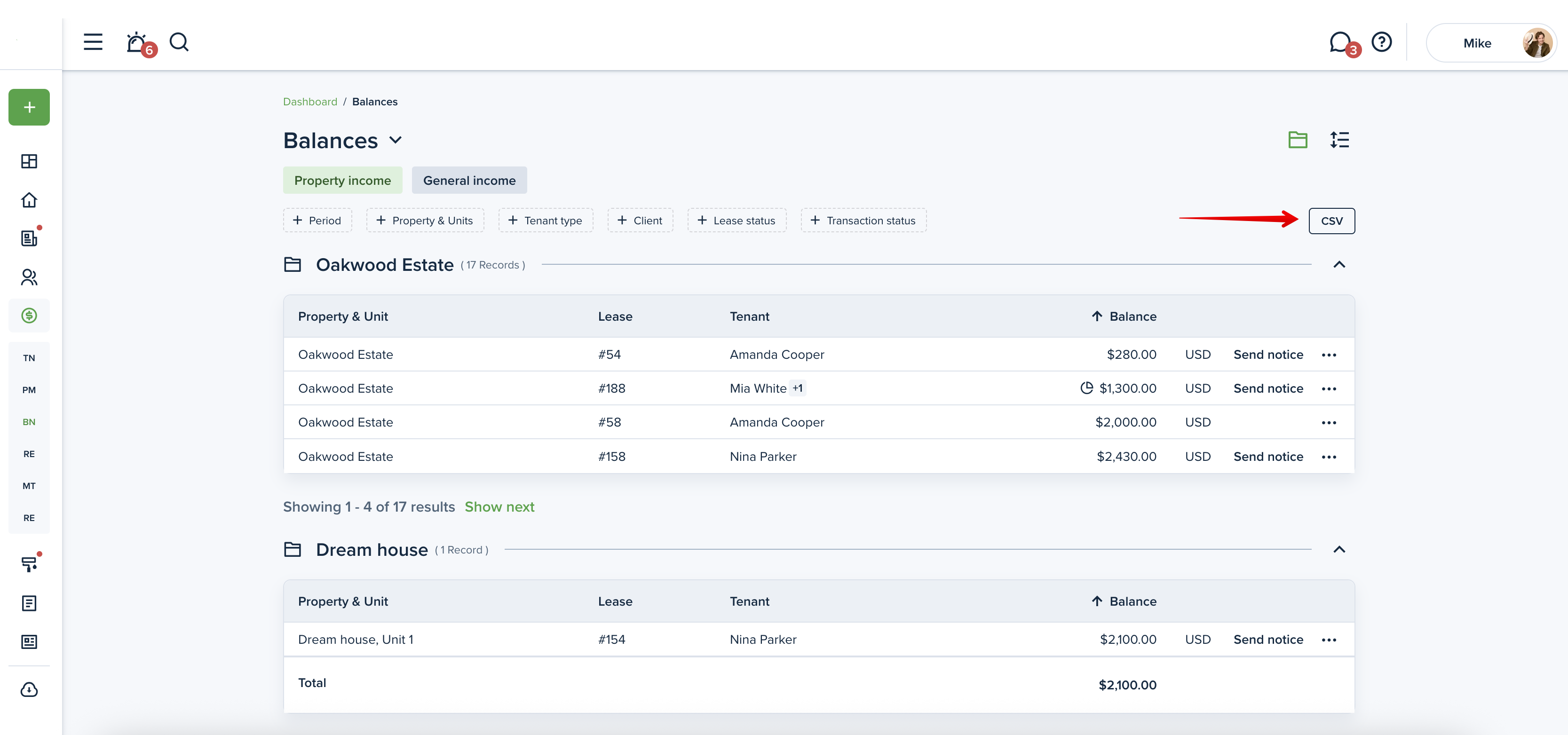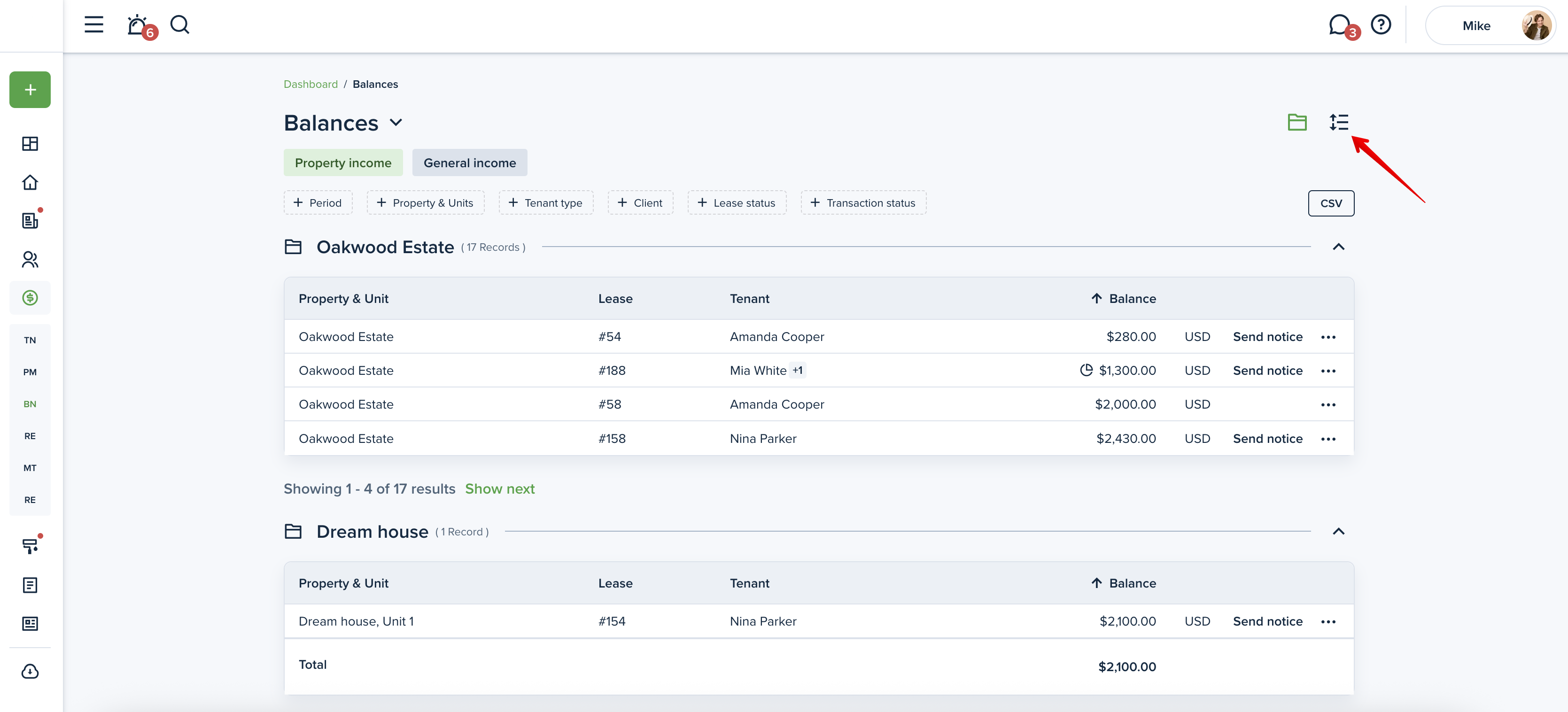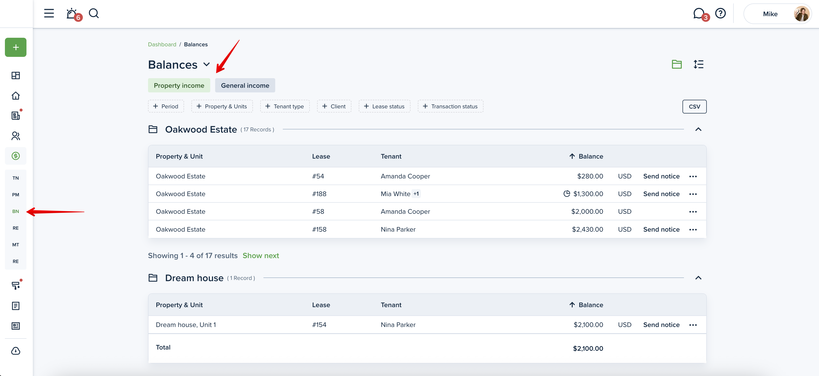 - General Income – balances are calculated per tenant based on their general income invoices.