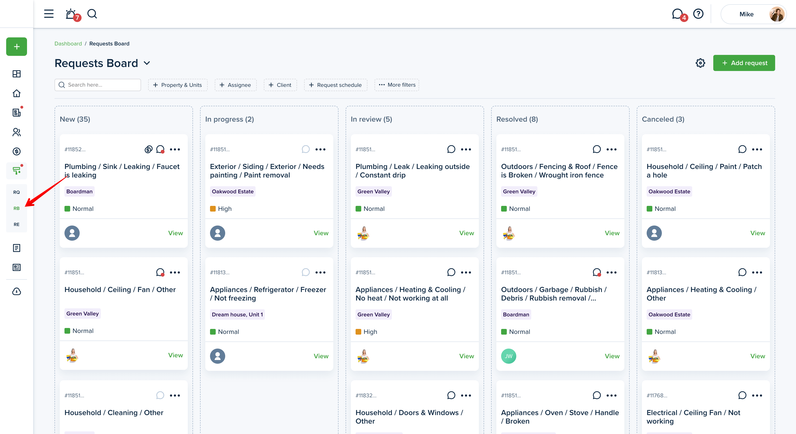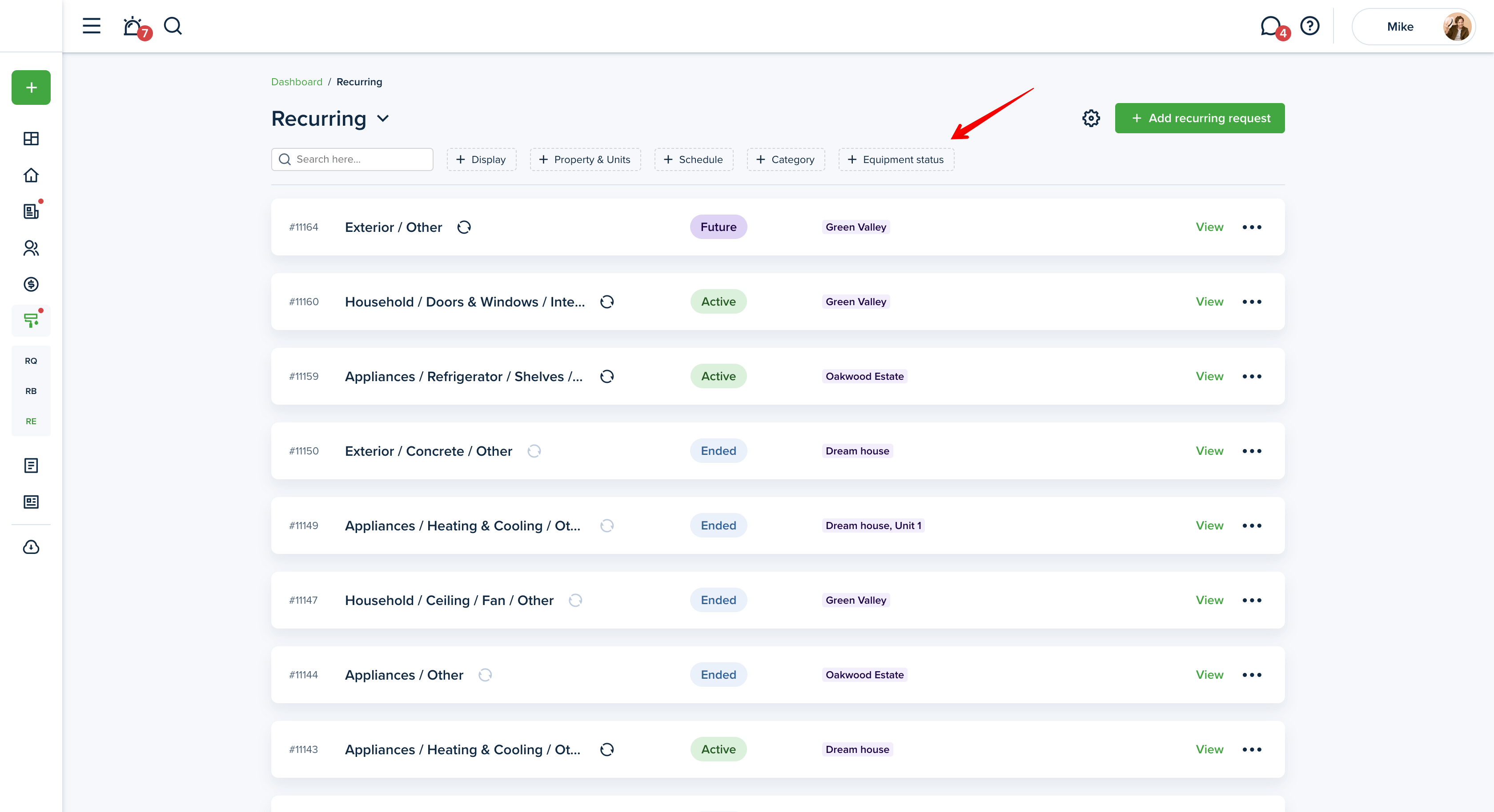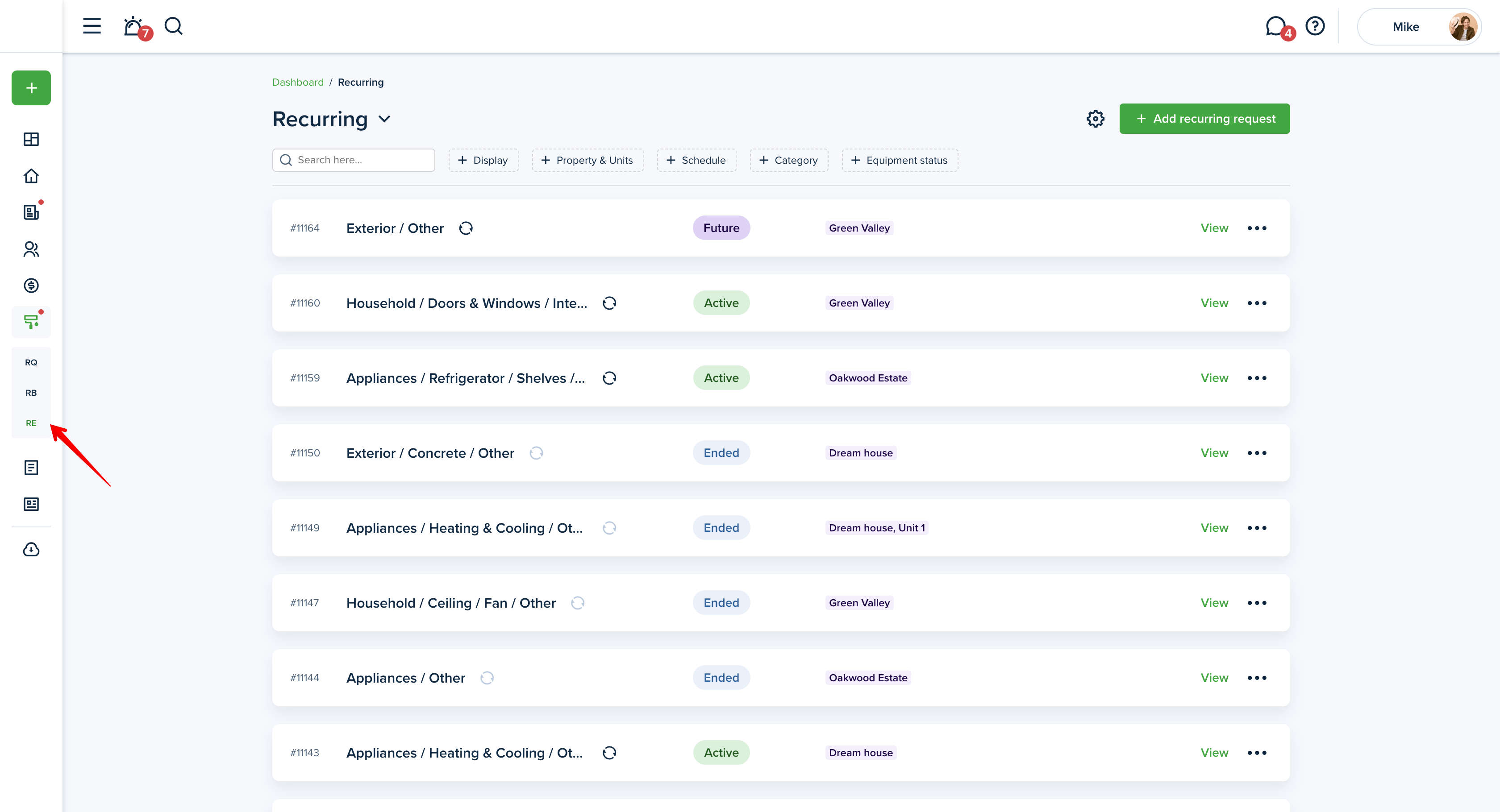 In order to filter your maintenance requests, go to the "Maintenance" section from the left-side menu of your dashboard. You will see three tabs, "Requests", "Requests board'' and "Recurring".