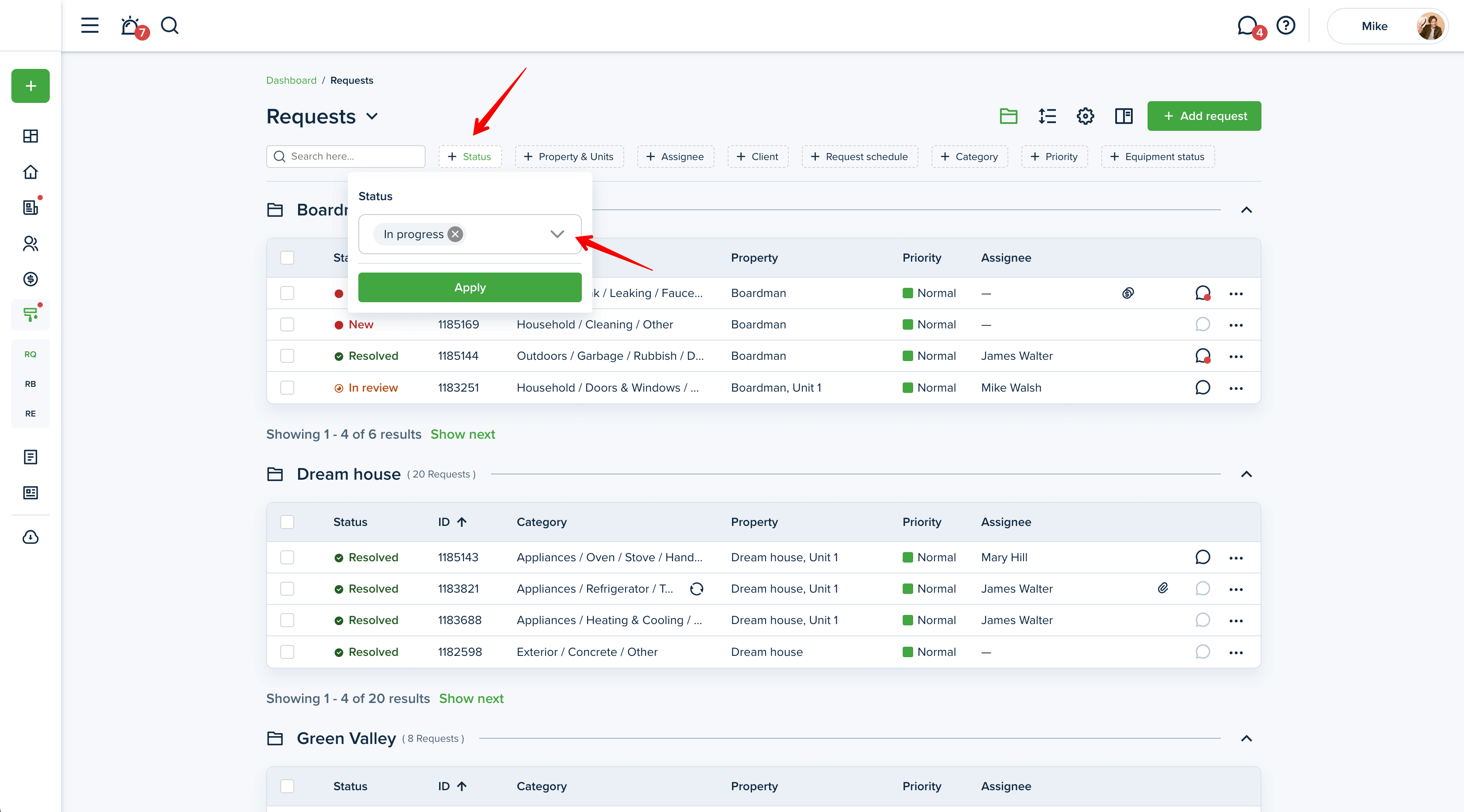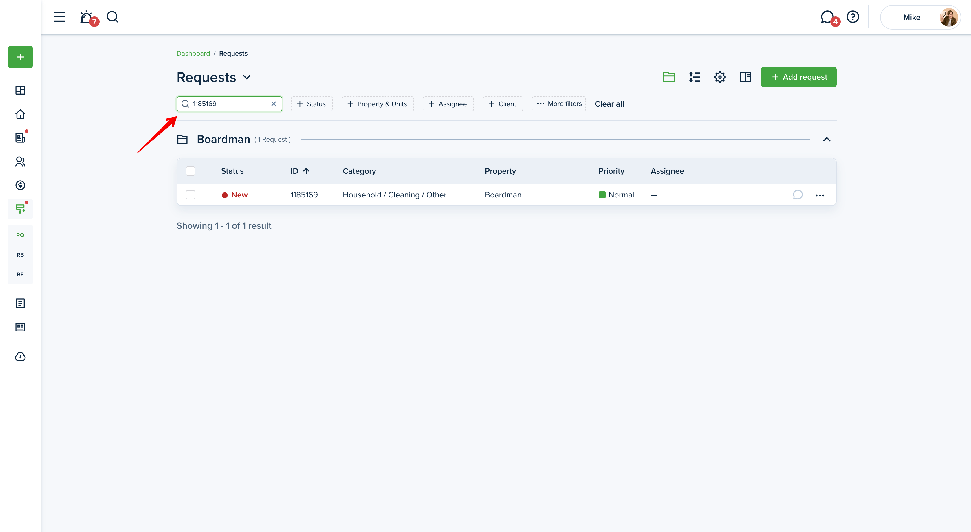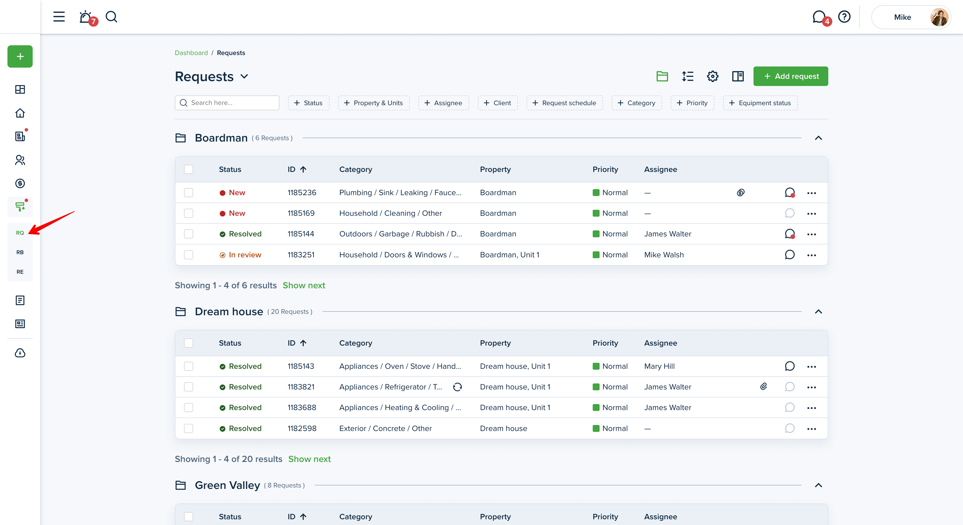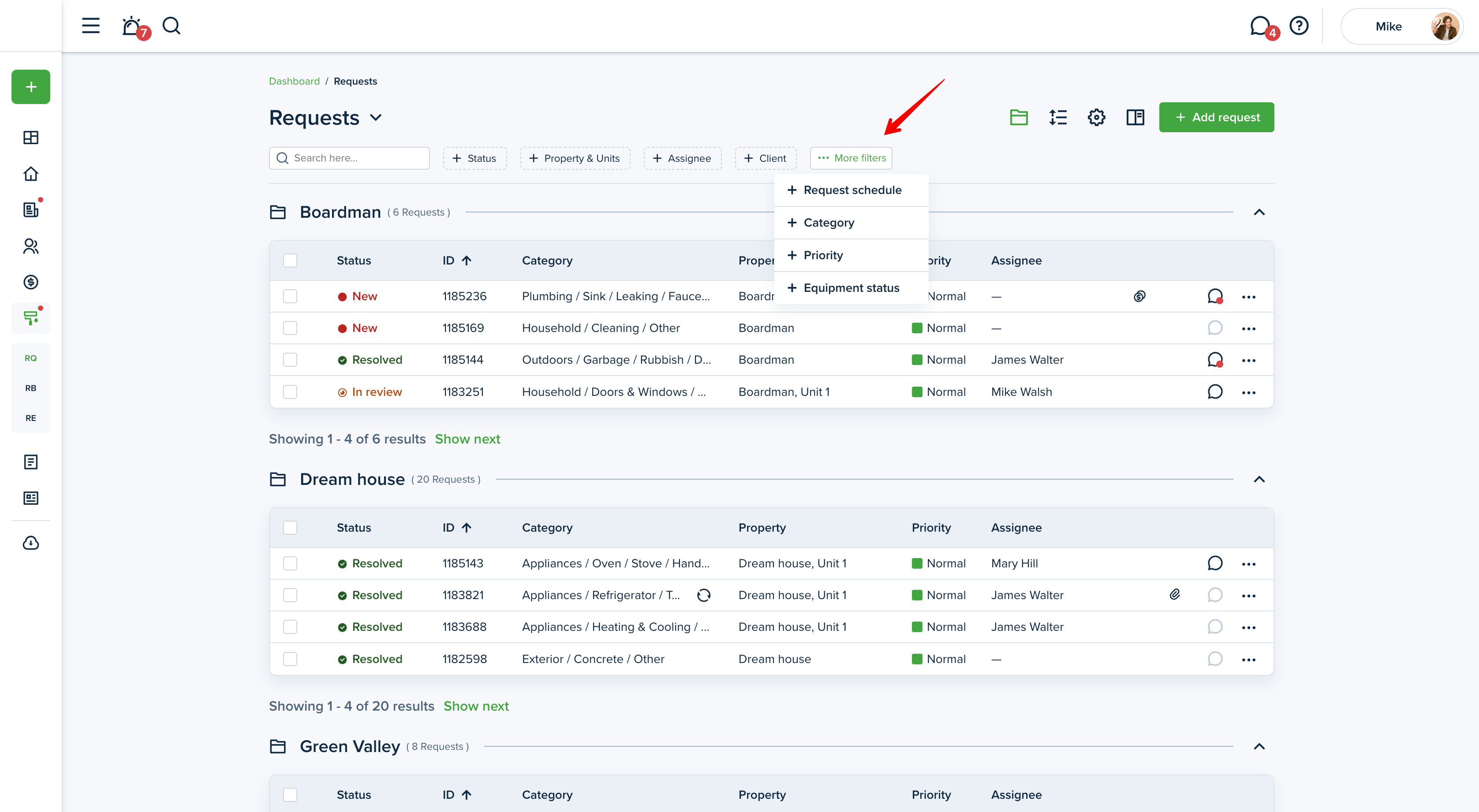 In order to filter your maintenance requests, go to the "Maintenance" section from the left-side menu of your dashboard. You will see three tabs, "Requests", "Requests board'' and "Recurring".