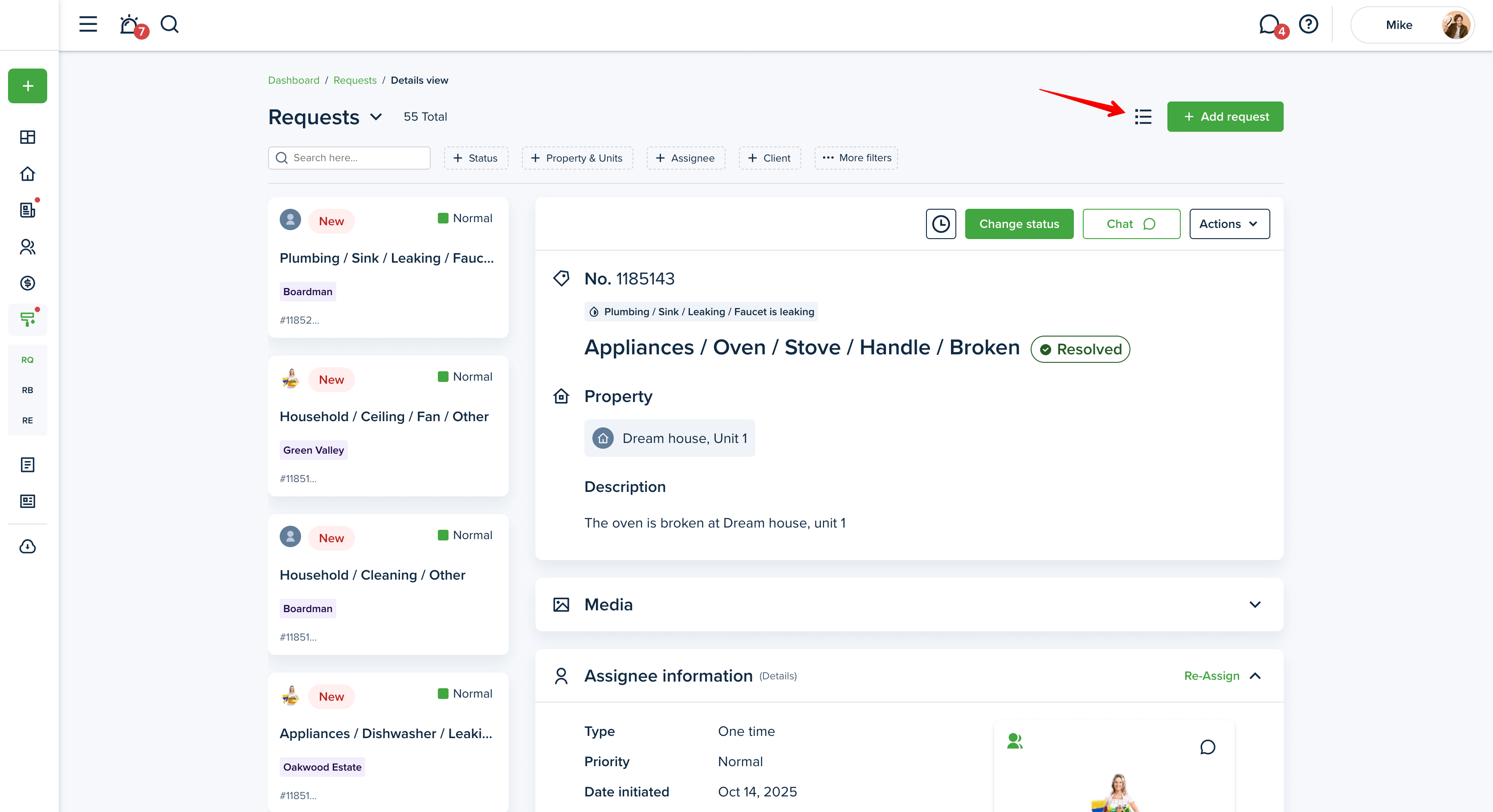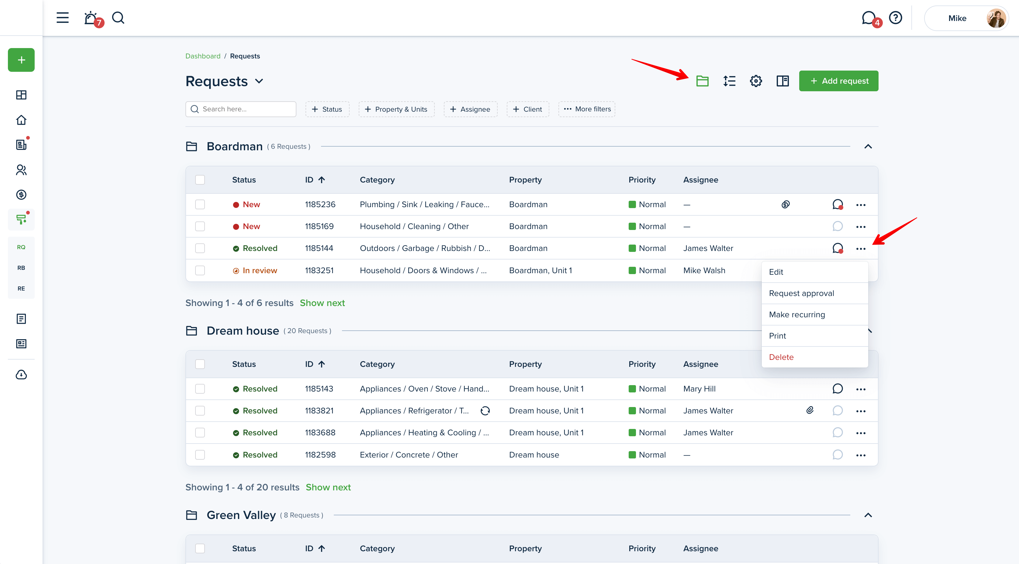 - List View - allows previewing the list of requests with the general information included: number, category/subcategory, status, assignee, a property associated, and priority. By clicking on the View button, you’ll be able to see the detailed description of a certain request. From the three dots action menu - easily edit, request approval (in a PM mode), make recurring, print, or delete the request. The swimlane option divides the requests per property and lets you view the requests in a more convenient, ordered way.