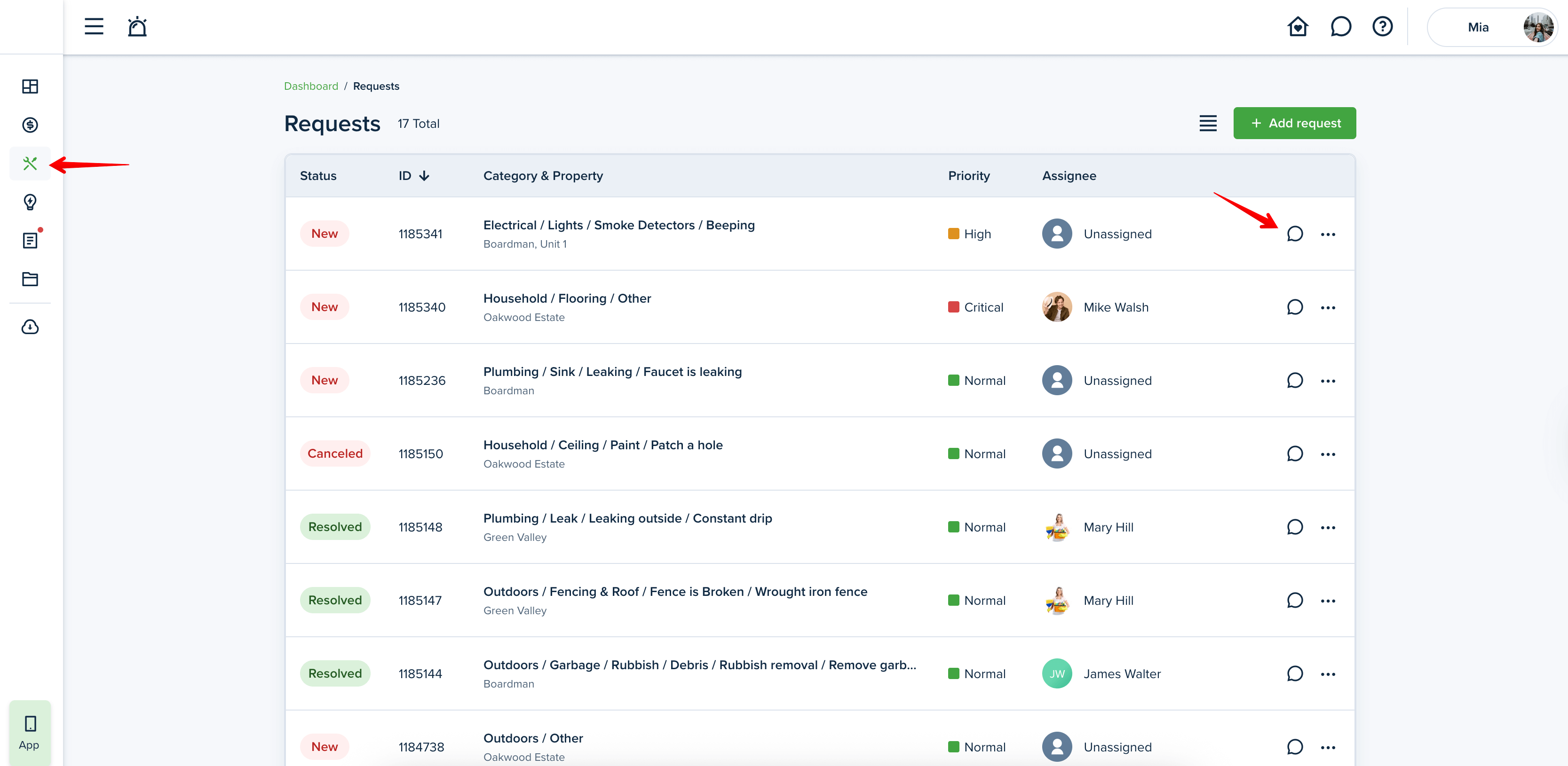 If you want to message your landlord regarding a specific maintenance request, go to the "Maintenance Requests" section from the left side menu of your dashboard. Find the required maintenance request, click on the "Messages " icon and you will be redirected to the Maintenance Request Chat in Messenger.