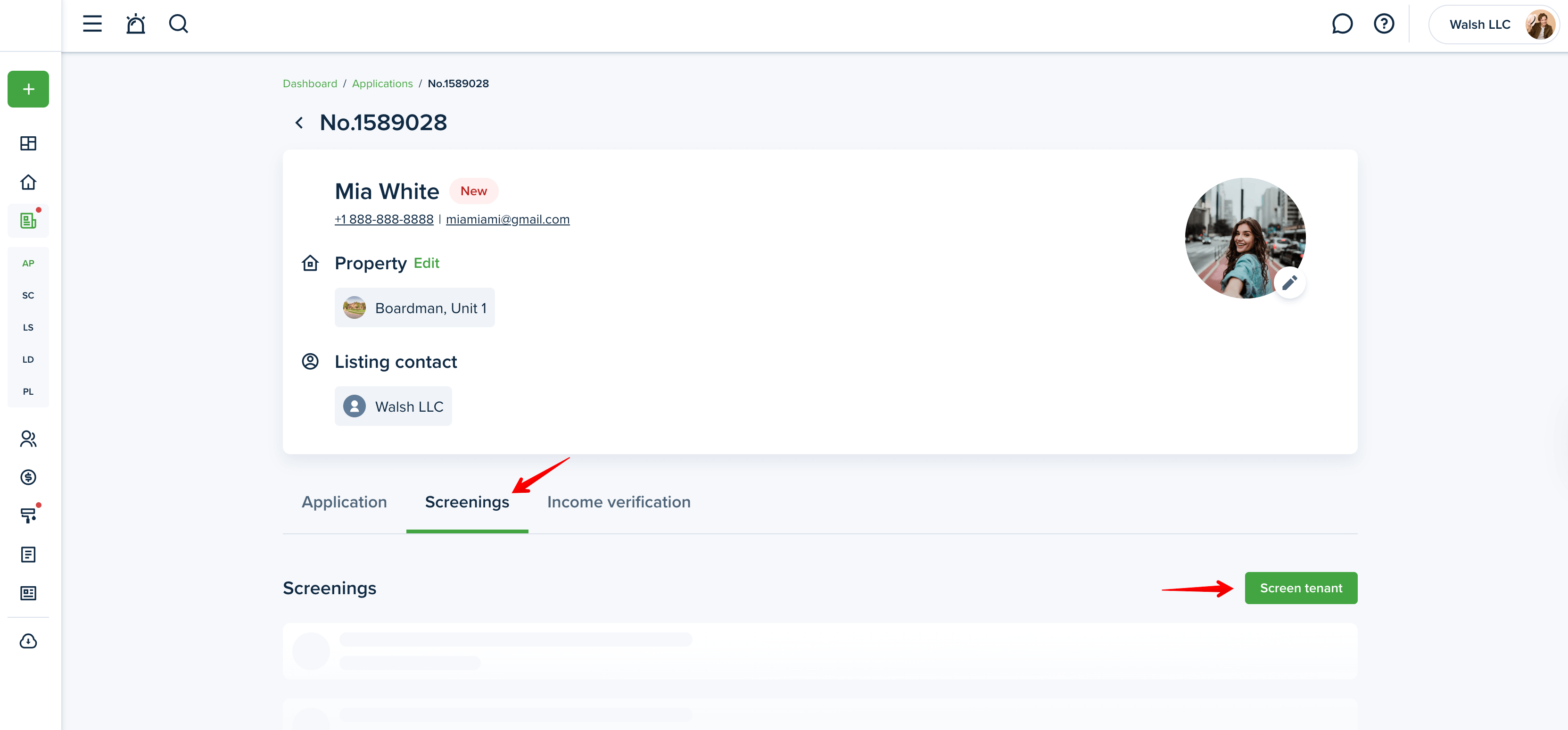 To do so, go to the “Applications” page, open the needed application, select the Screenings tab and push the “Screen Tenant” button.