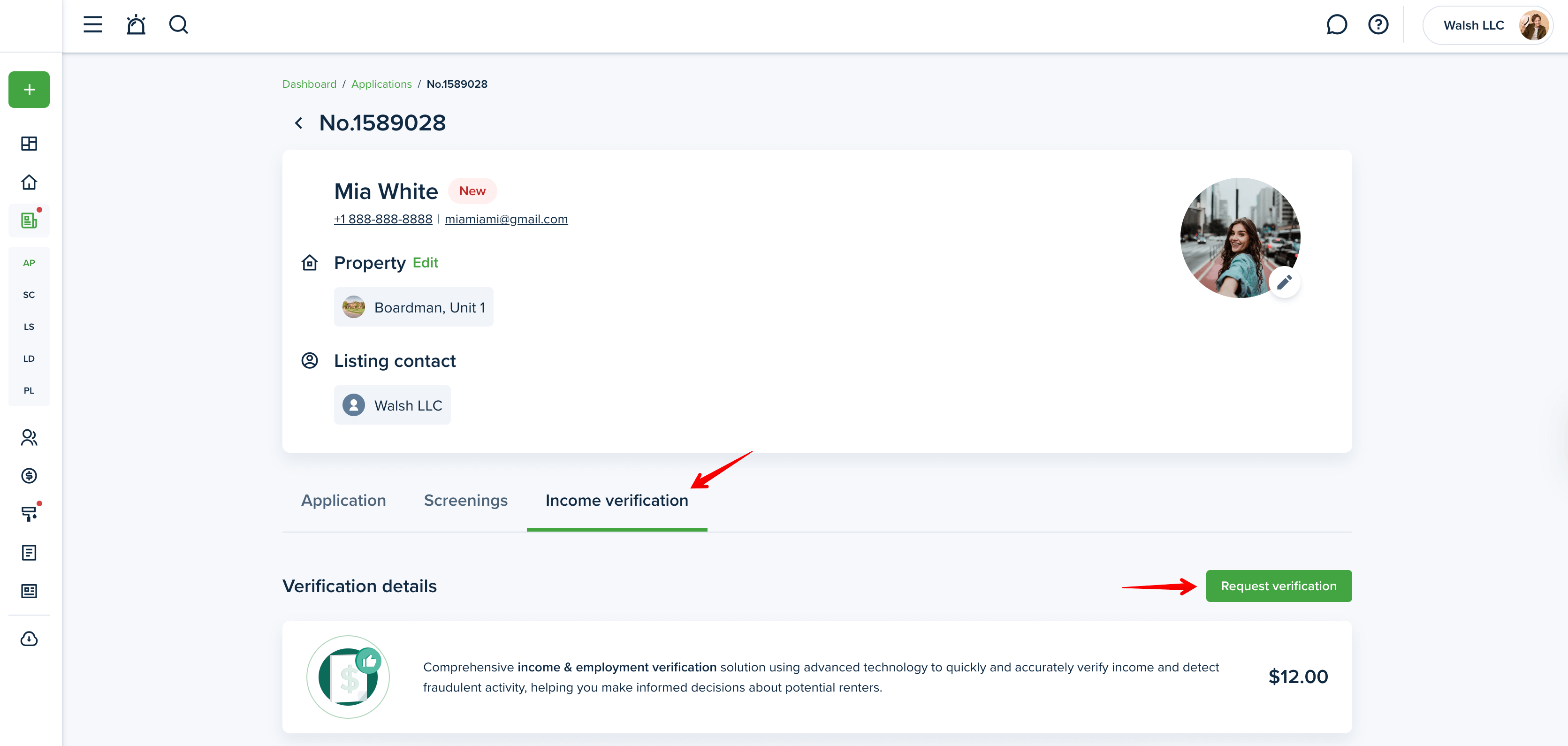 For additional income details, you can request income verification from an applicant. To proceed, select the “Income Verification” sub-tab and click the “Request verification” button.