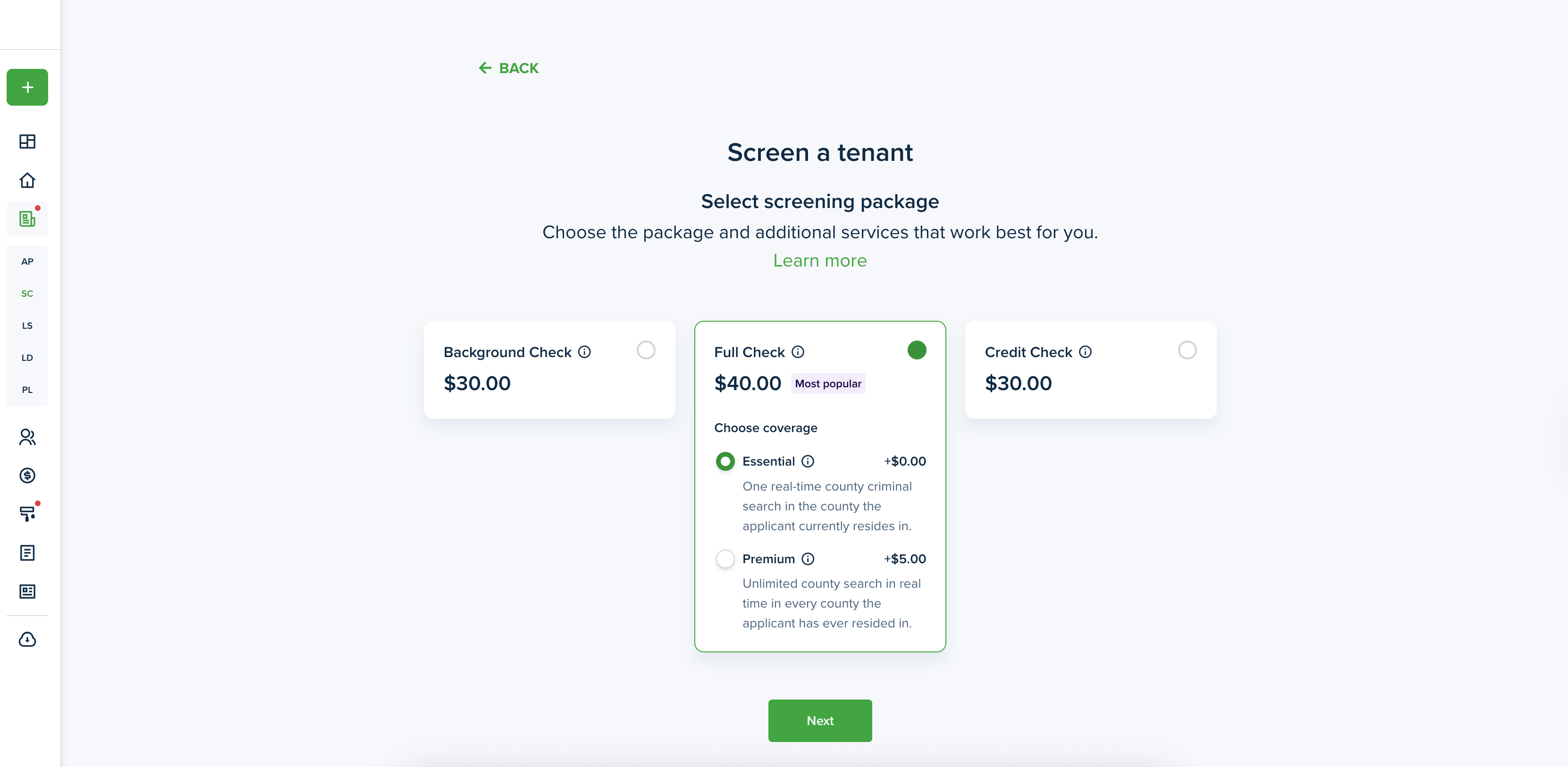 On the next step you can select one of the following screening packages powered by TransUnion and Asurint: Background Check ($30), Full Check ($40), and Credit Check ($30). Both a Background and Full Check report can be ordered with the standard Essential coverage package or with a more detailed Premium coverage package for an additional $5.