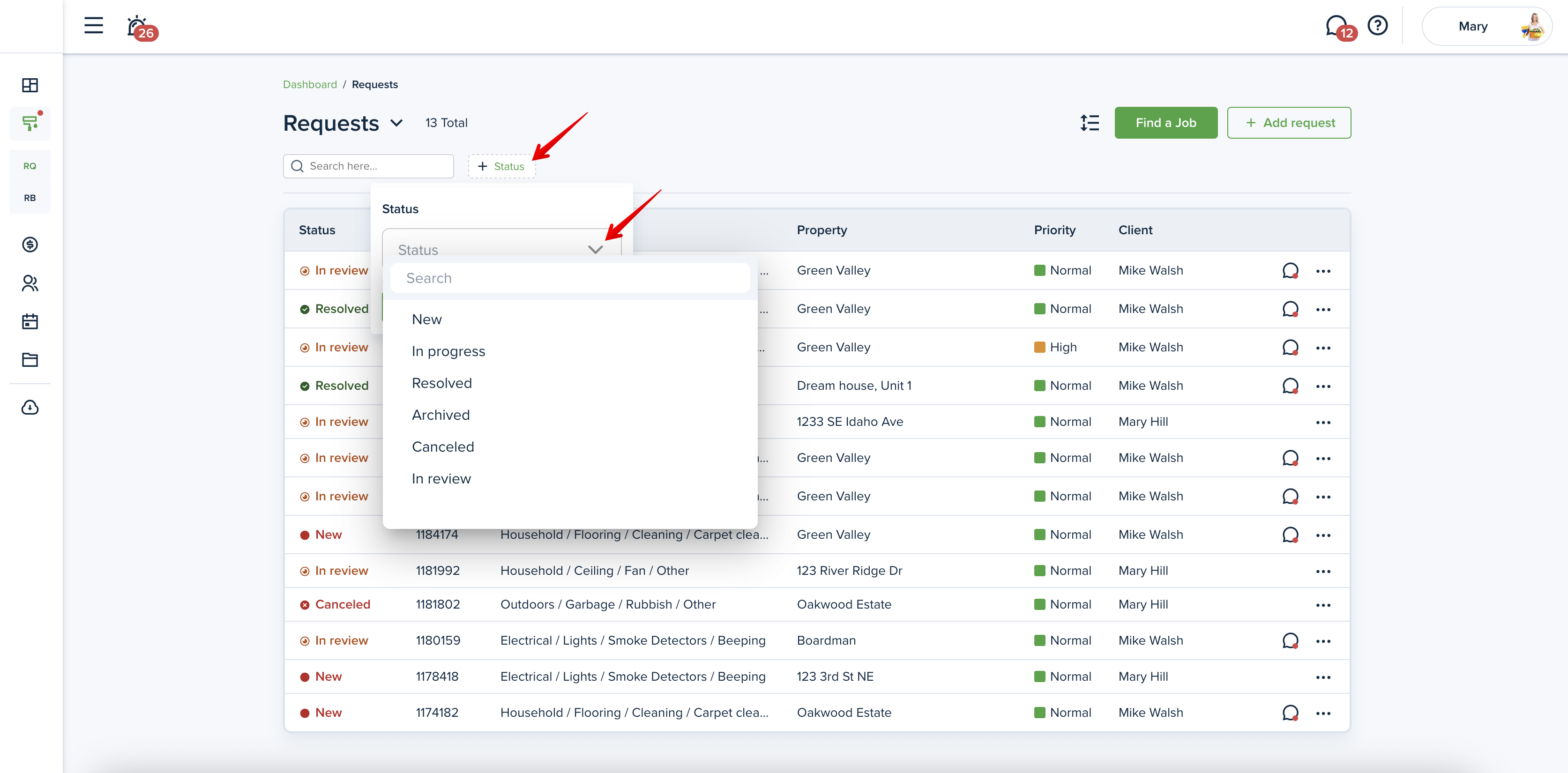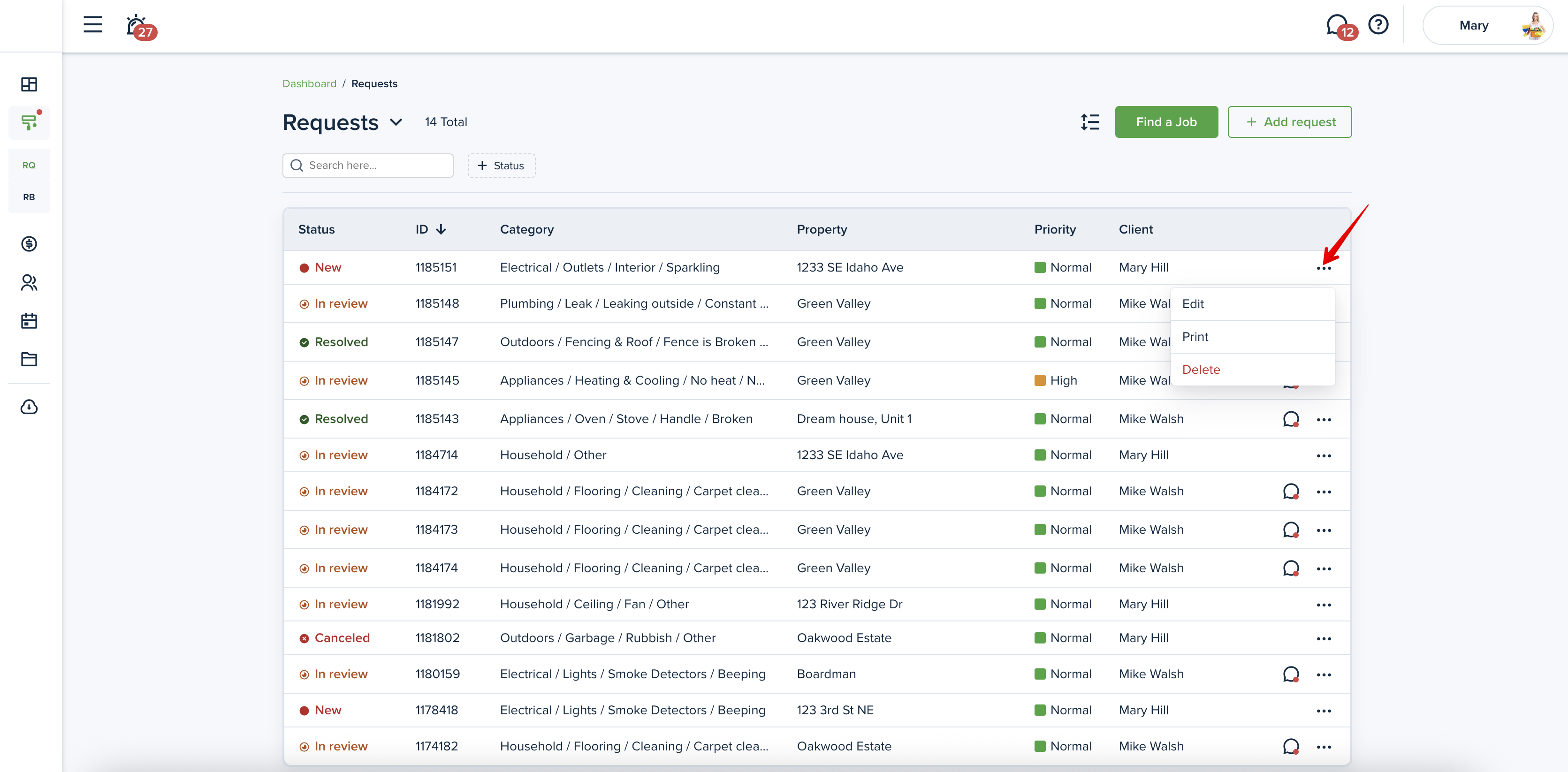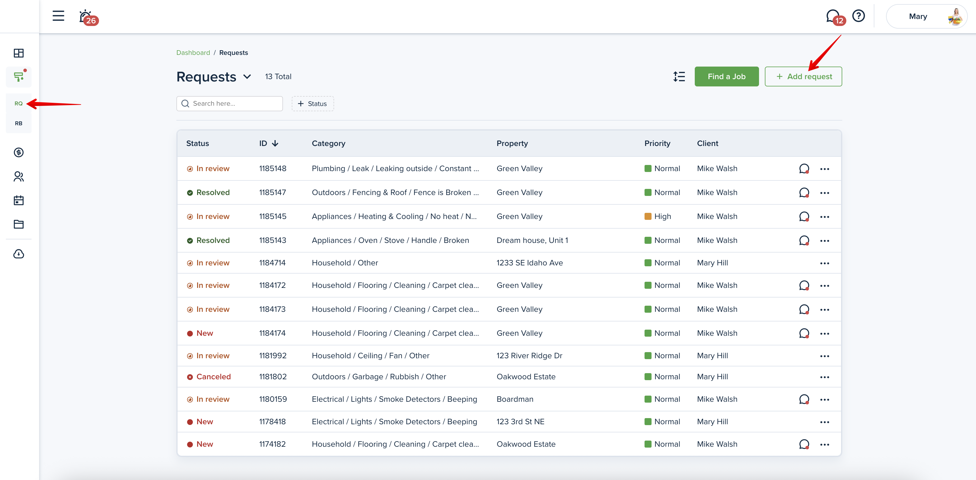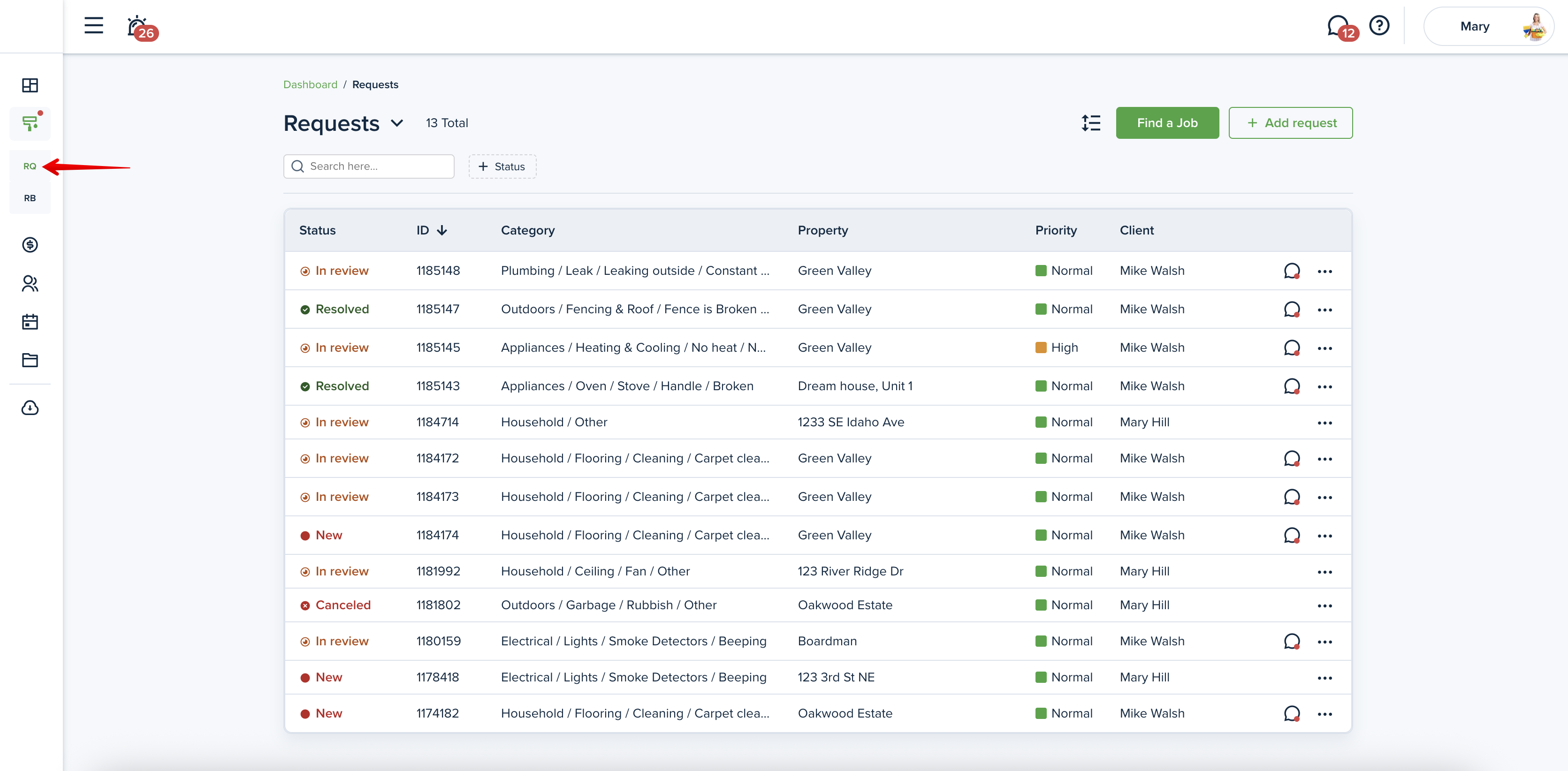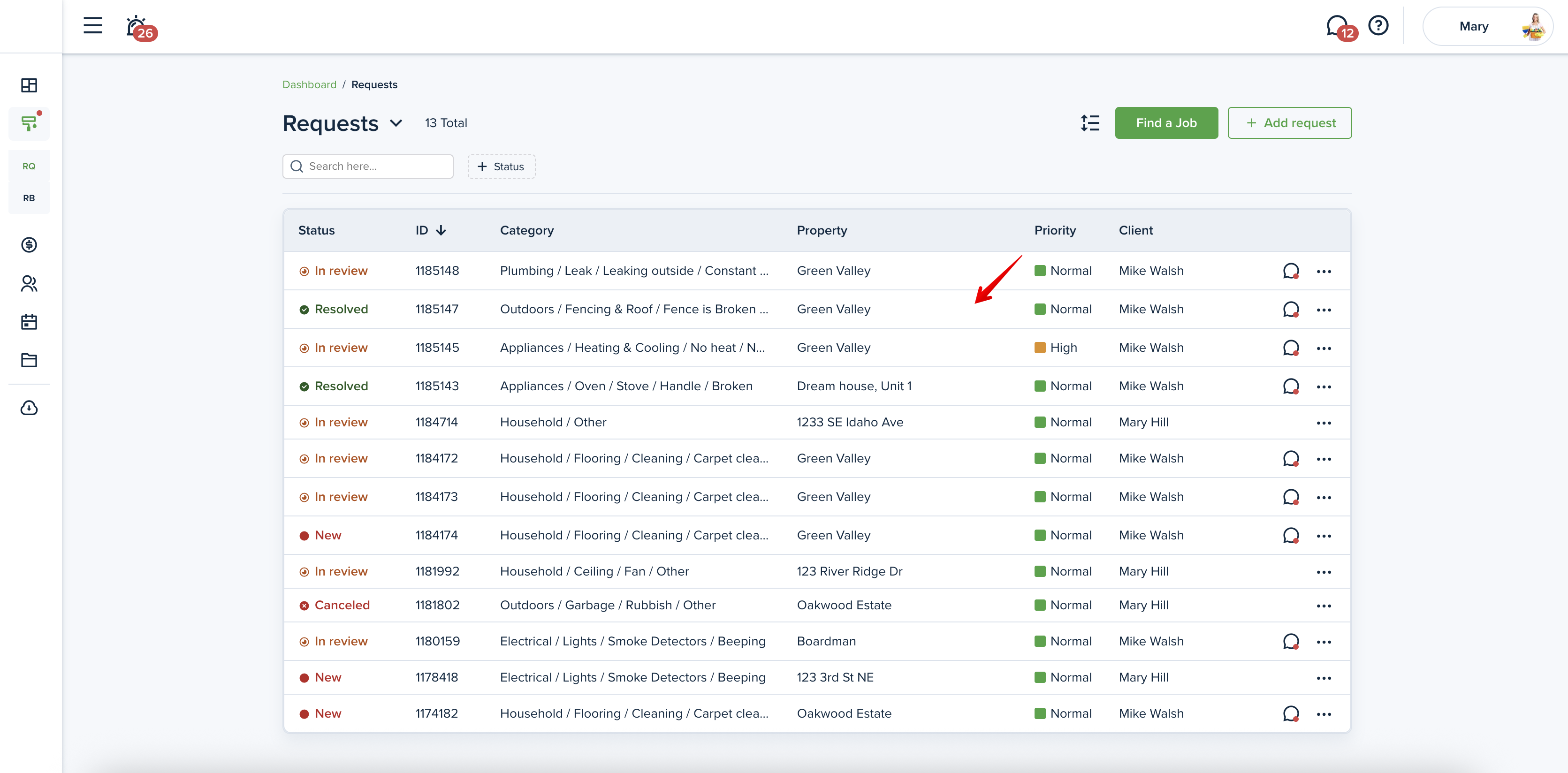 To view the maintenance requests, including those created by you, please go to the “Requests" page from the left-side menu. You will be able to see the status of the Request and how urgent it is: